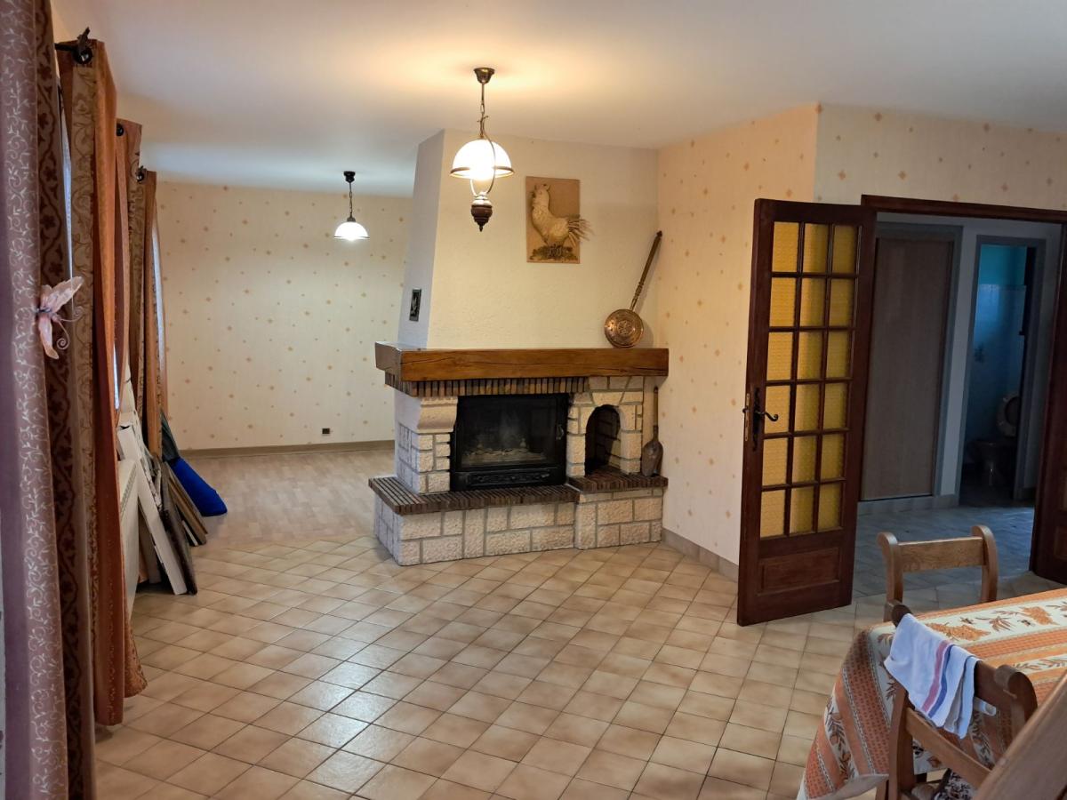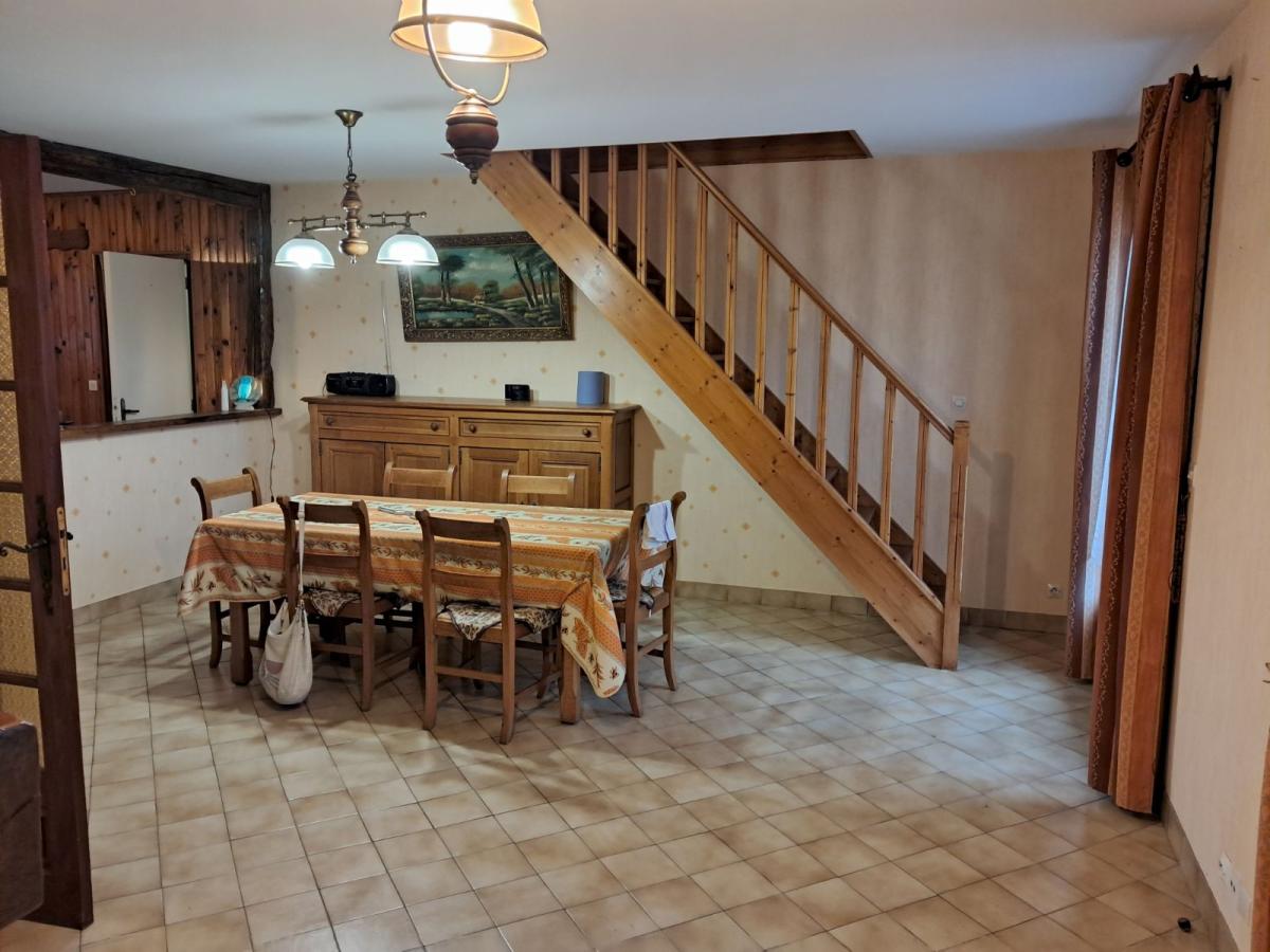 Entrée avec placard (5,49 m²) - WC - Cuisine aménagée (12,57 m²) / Salle à manger (17 m²), cheminée et insert - Partie salon (16,50 m²) - Salle d’eau - 2 chambres
