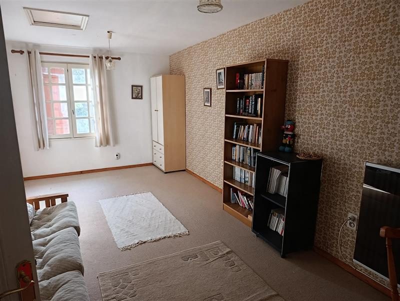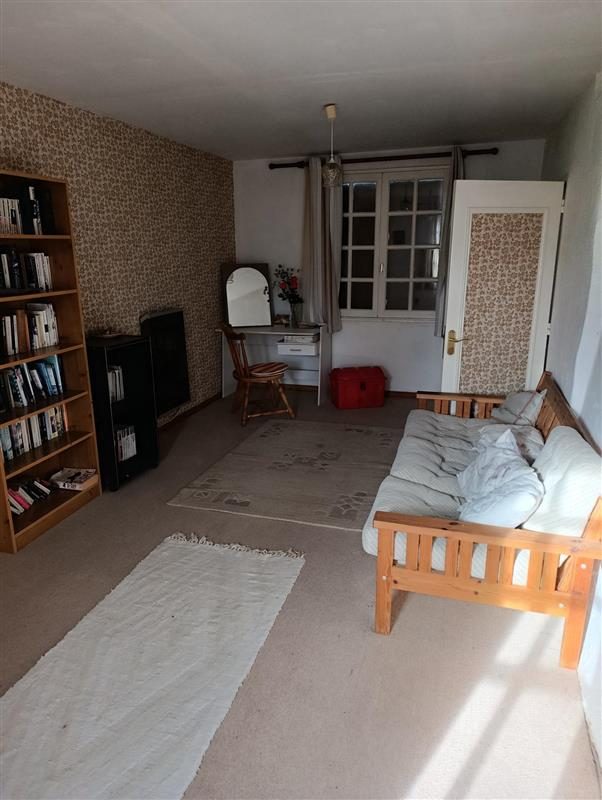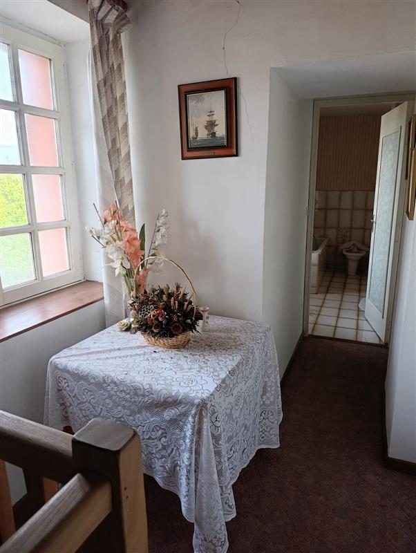 - Au rez-de-chaussée : entrée sur pièce de vie avec poêle à bois, cuisine, buanderie, WC