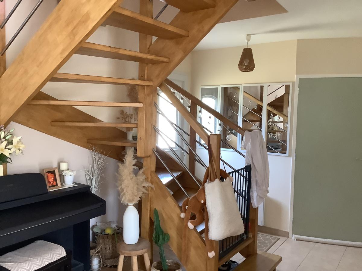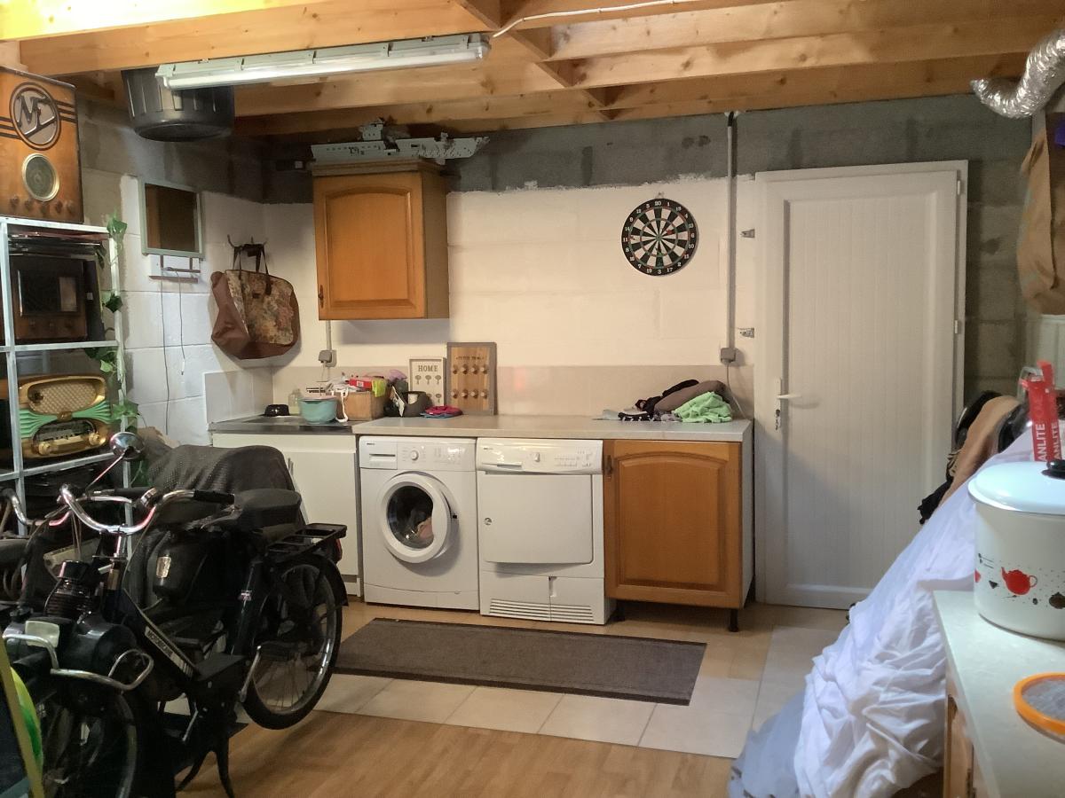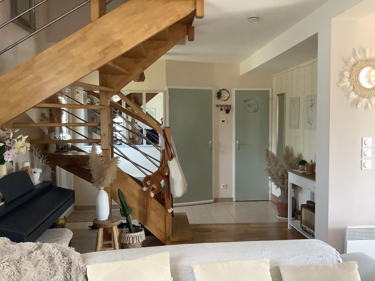 Au rez-de-chaussée: une entrée, une cuisine ouverte sur salle à manger/salon avec un poêle, un cellier, un wc.