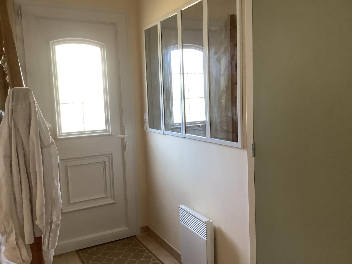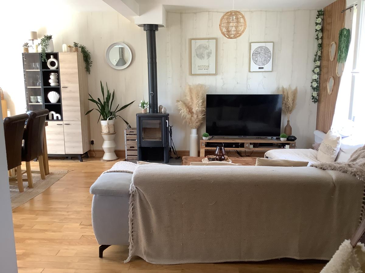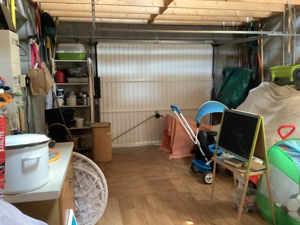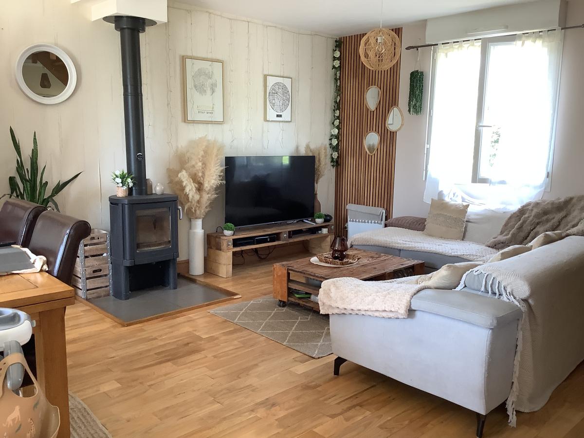 Au rez-de-chaussée: une entrée, une cuisine ouverte sur salle à manger/salon avec un poêle, un cellier, un wc.