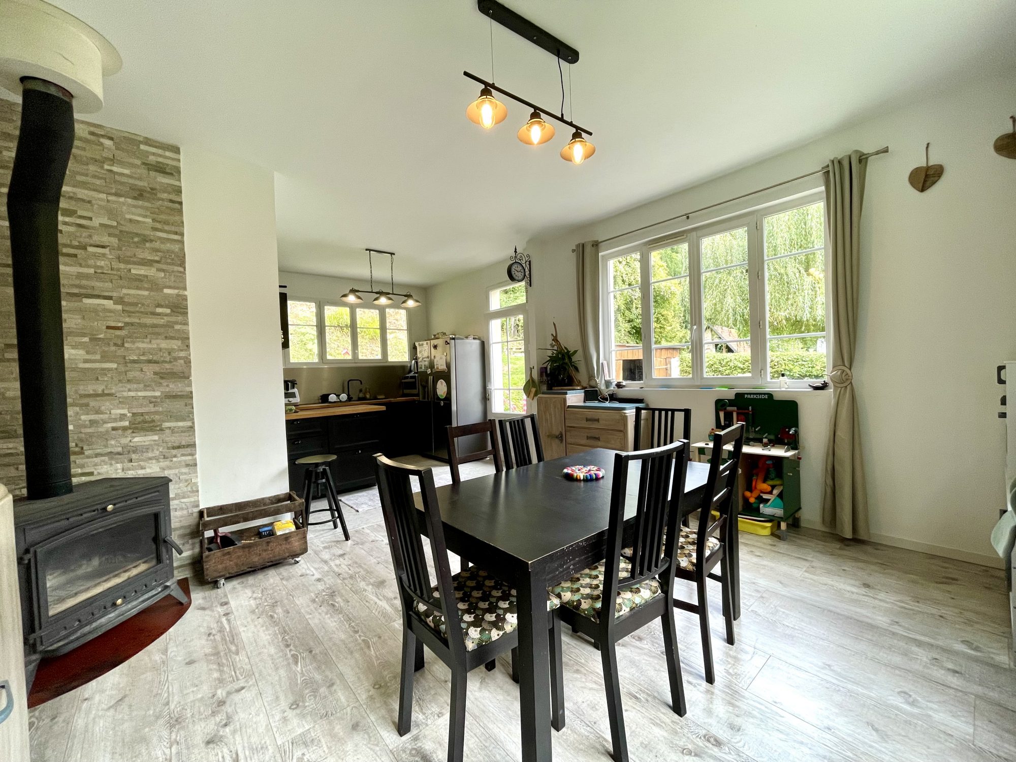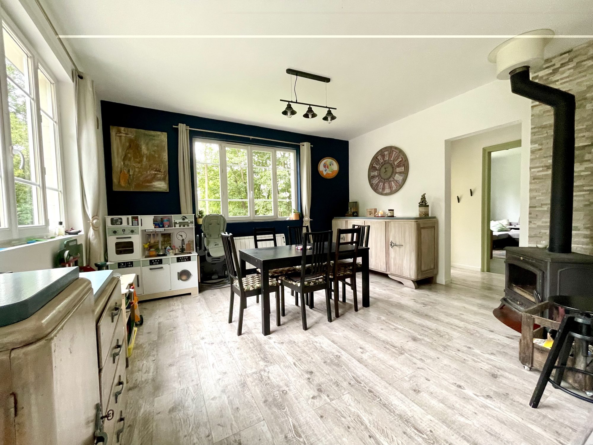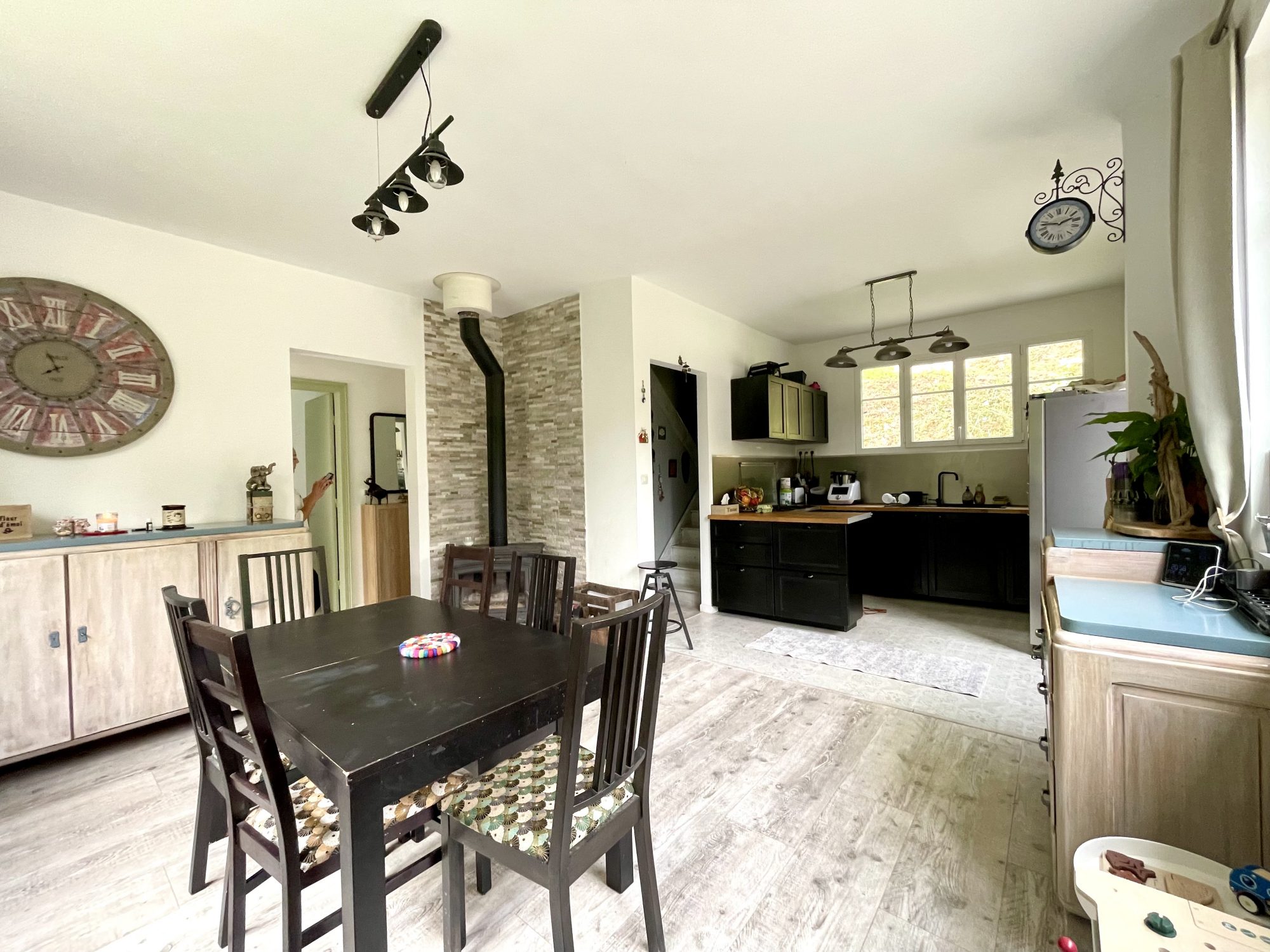 Maison d'habitation de 98 m² comprenant une cuisine aménagée et équipée ouverte sur séjour avec poêle à bois , un salon, une salle de bains , wc et chambre avec dressing .