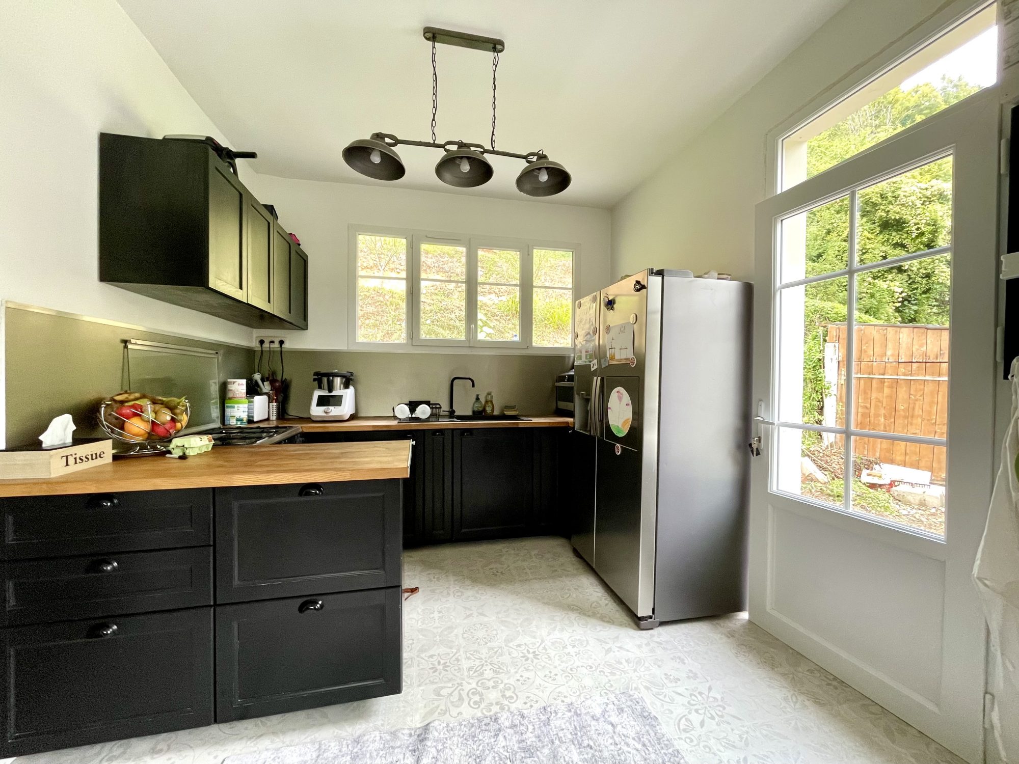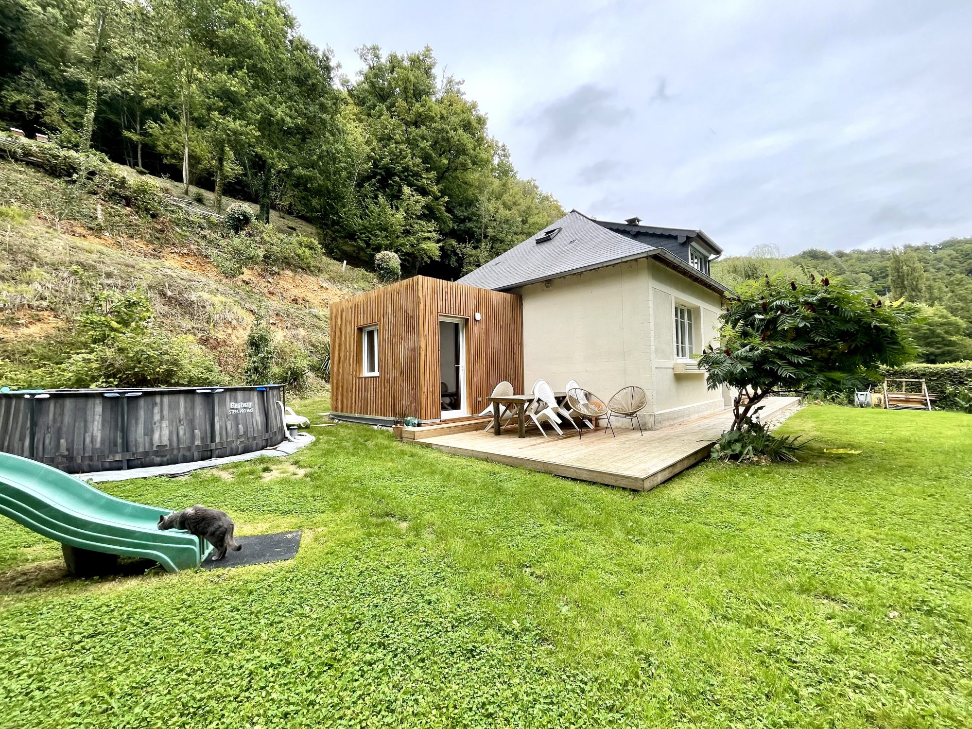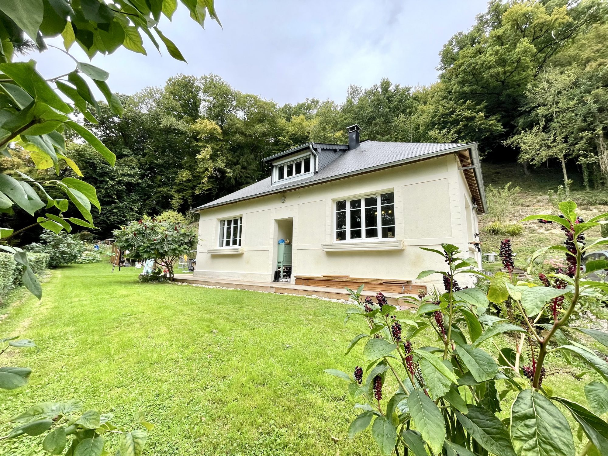 Maison d'habitation de 98 m² comprenant une cuisine aménagée et équipée ouverte sur séjour avec poêle à bois , un salon, une salle de bains , wc et chambre avec dressing .