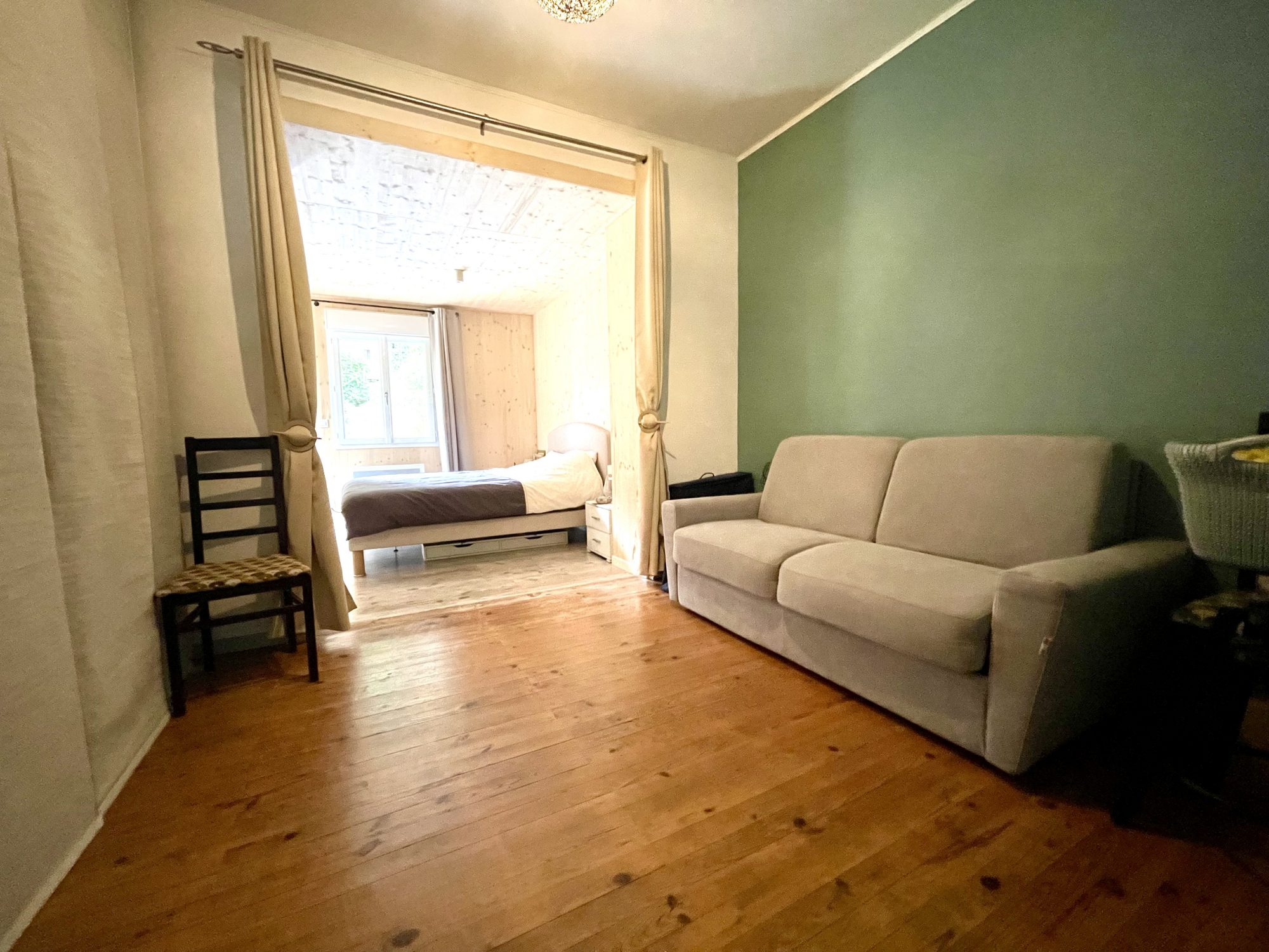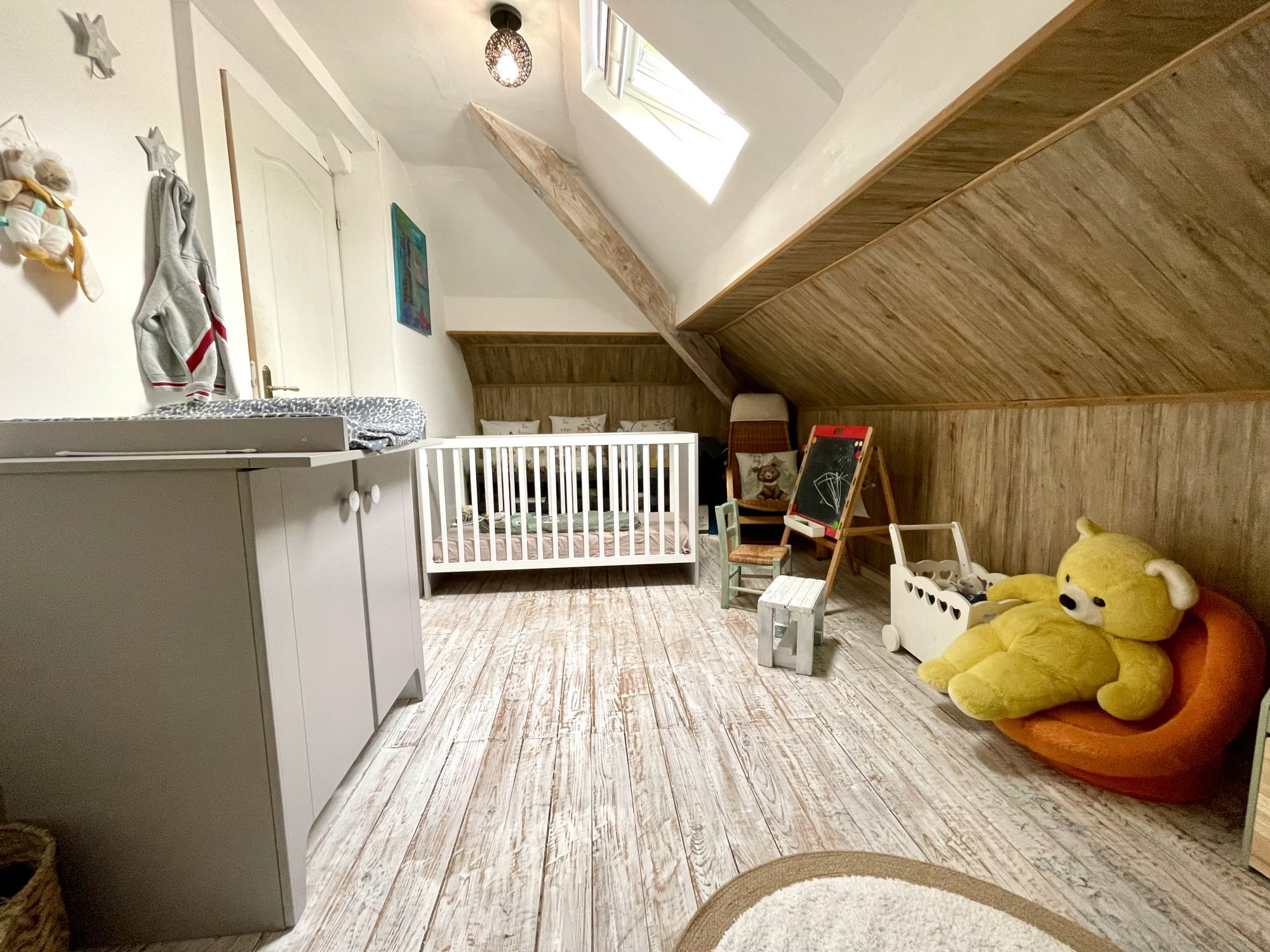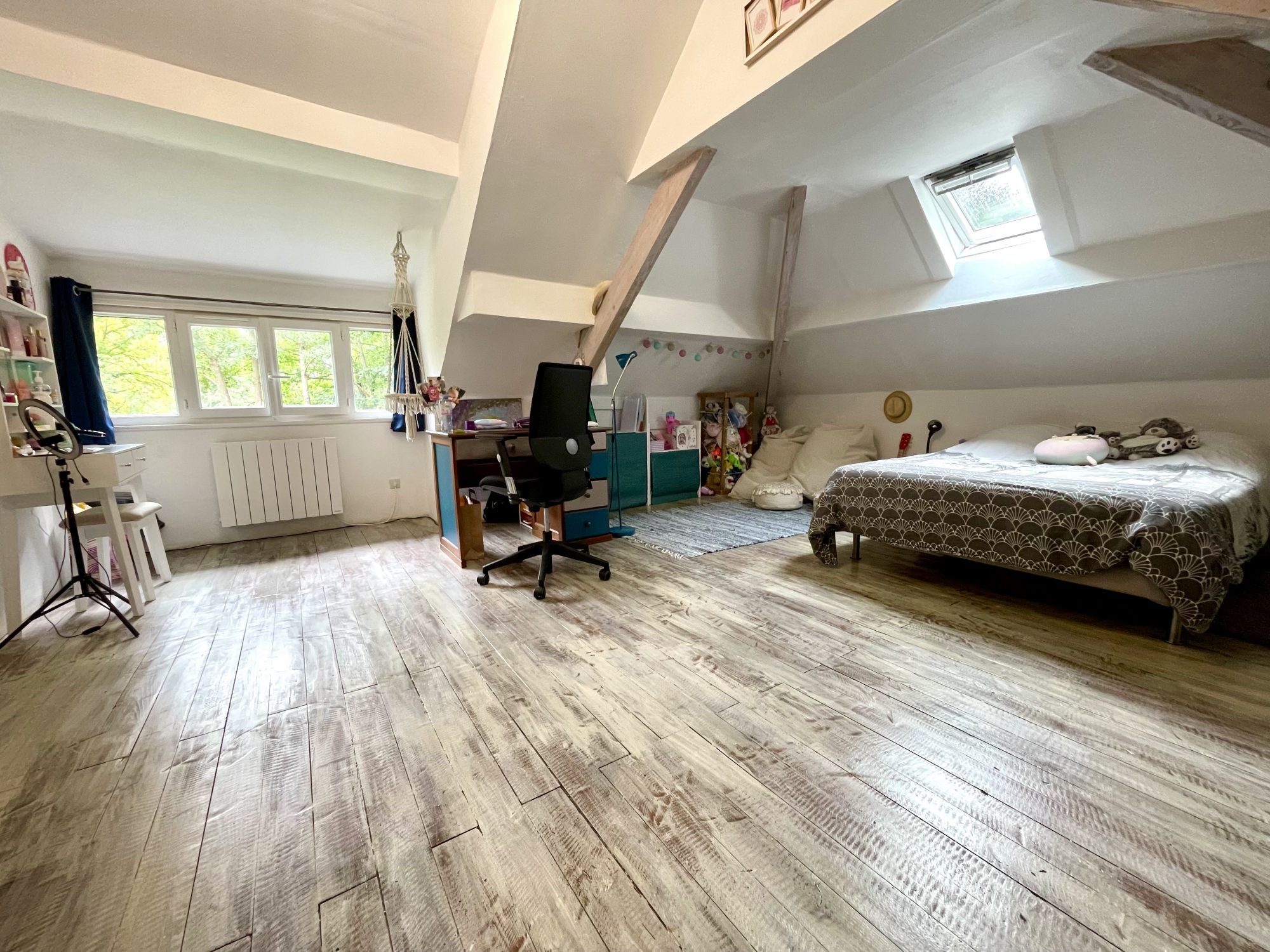 A l'étage une grande chambre de 15 m² et petite chambre mansardée.