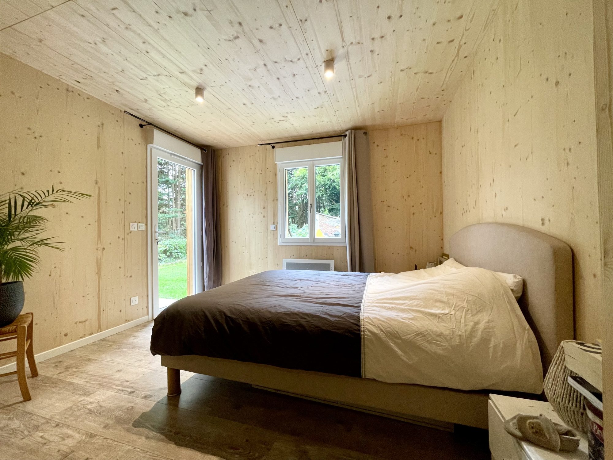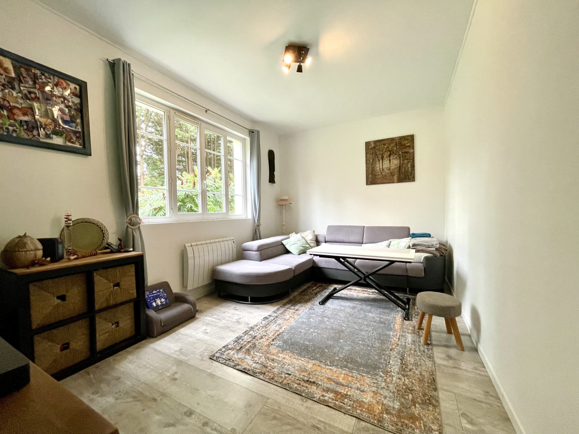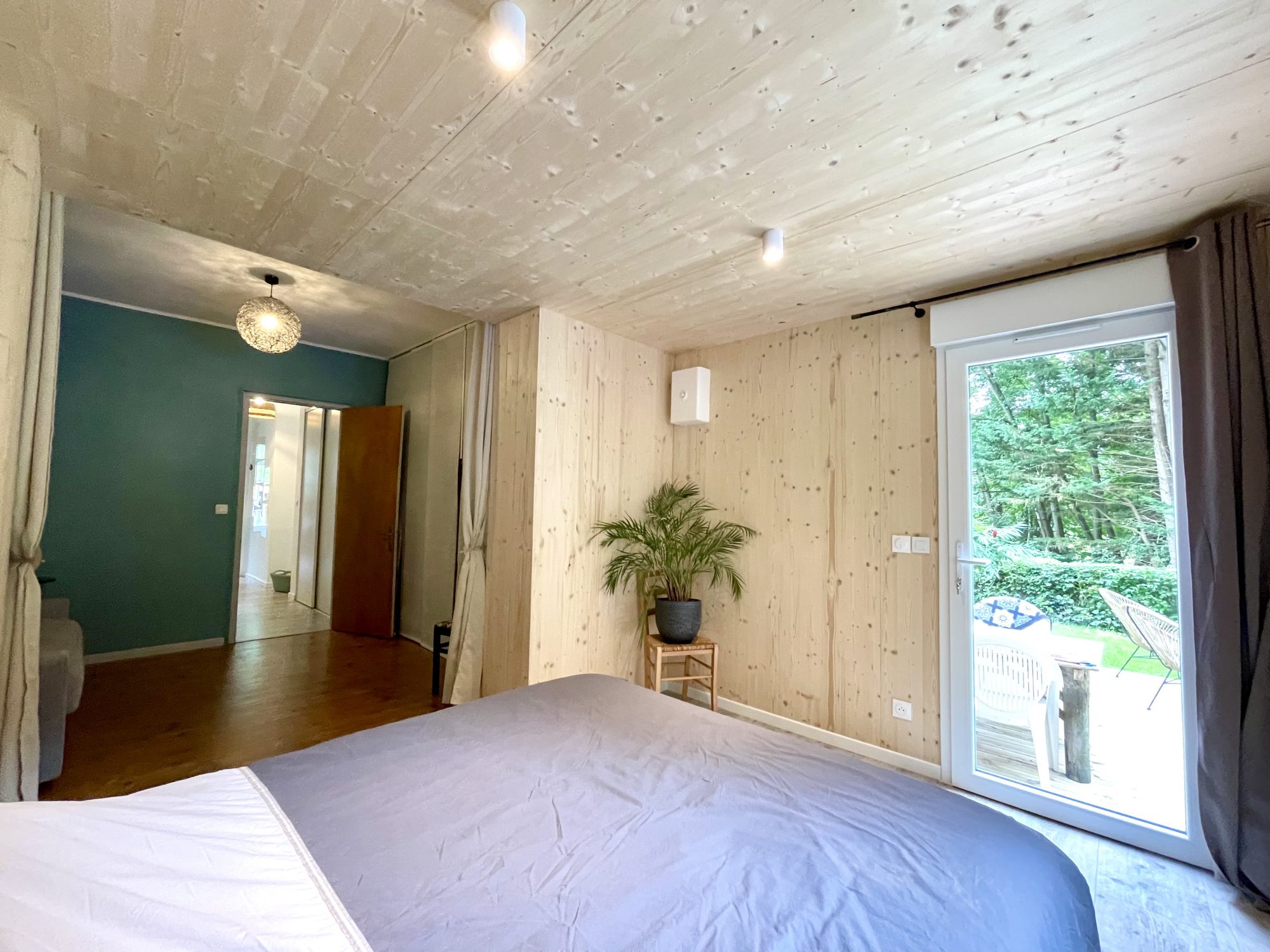 A l'étage une grande chambre de 15 m² et petite chambre mansardée.
