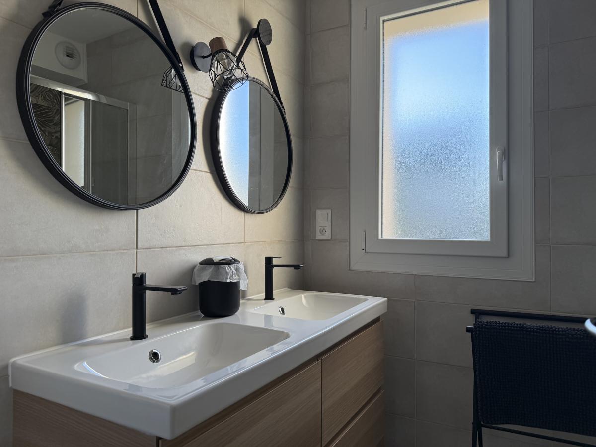 - À l’étage : deux chambres avec placards, bureau, salle de douches avec WC.