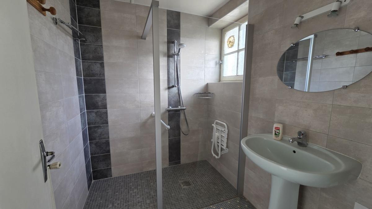 Au rez-de-chaussée: Salon séjour plein sud, cuisine séparée, dégagement, WC, salle d'eau (rénovée e 2018), chaufferie avec chaudière fioul et une chambre, ce qui permet d'avoir le nécessaire de vie de plain-pied.