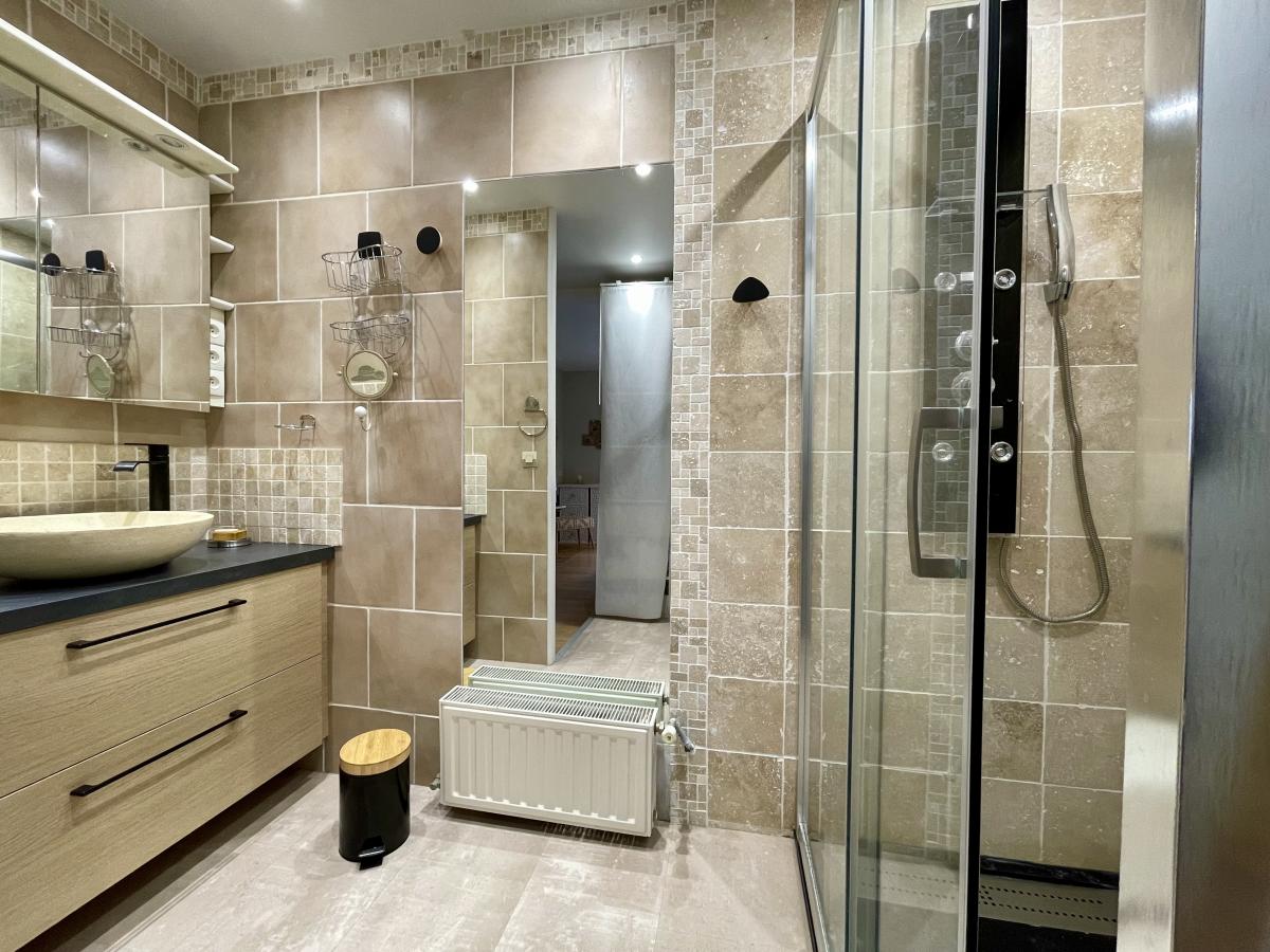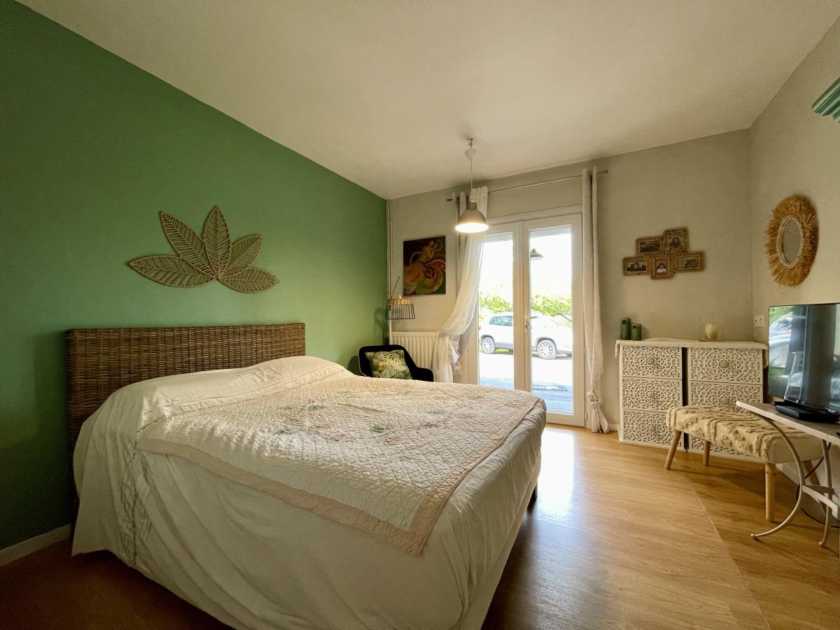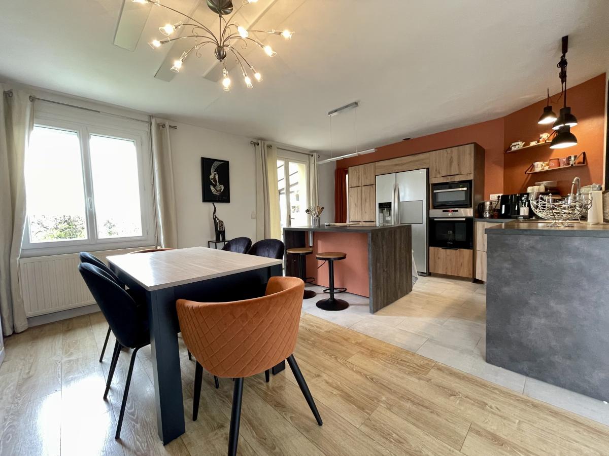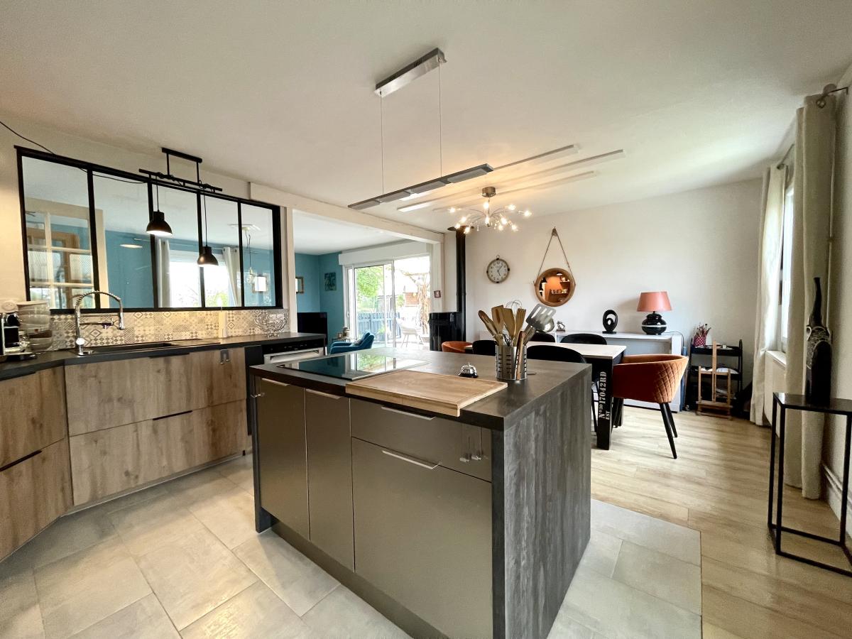 Au rez-de-chaussée une entrée desservant un séjour avec poêle à granulés , cuisine aménagée et équipée ouverte , une chambre avec salle d'eau , wc , véranda et garage .