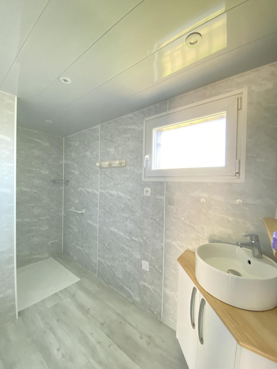 - Au rez-de-chaussée : entrée, cuisine, salle à manger, salon, salle de douches avec WC.