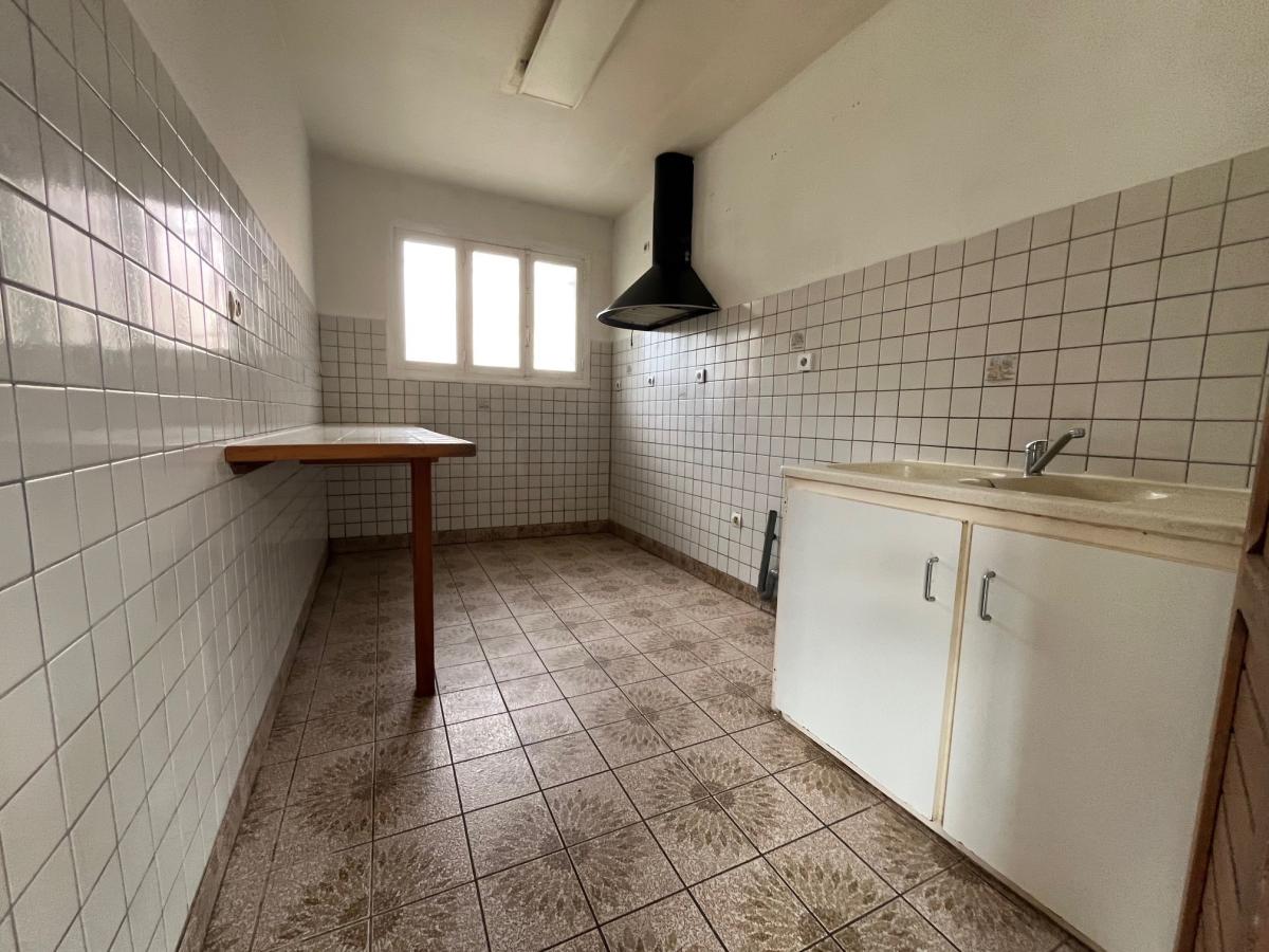 Entrée, cuisine équipée 15 m² (éléments hauts et bas, plaque de cuisson, hotte, four, lave-vaisselle), séjour 25 m², salle de douches avec wc,