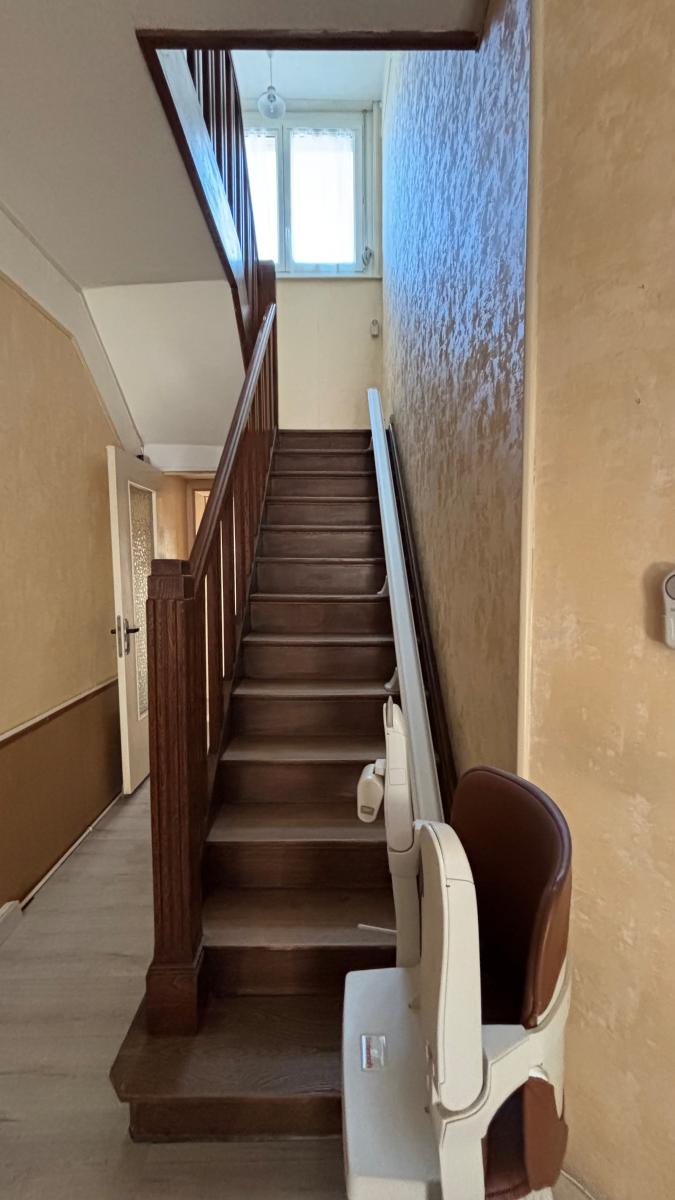 À l’étage, le palier distribue deux chambres, une salle de bain avec WC et un accès à un grenier aménageable, offrant un beau potentiel d’agrandissement.