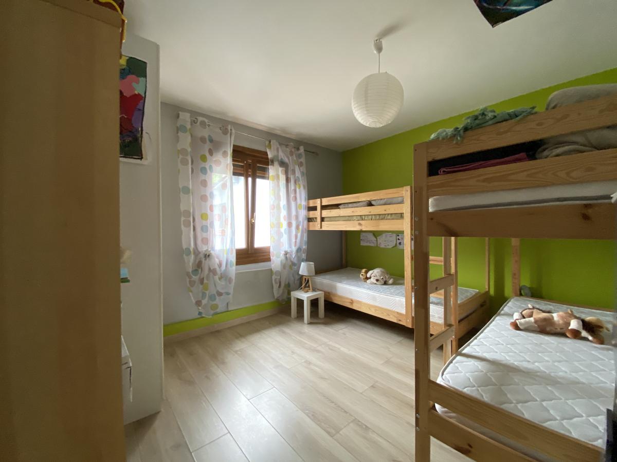 Son intérieur de 106 m² habitable comprend : entrée, salon, salle à manger, cuisine équipée, couloir, salle de bains, WC et quatre chambres.