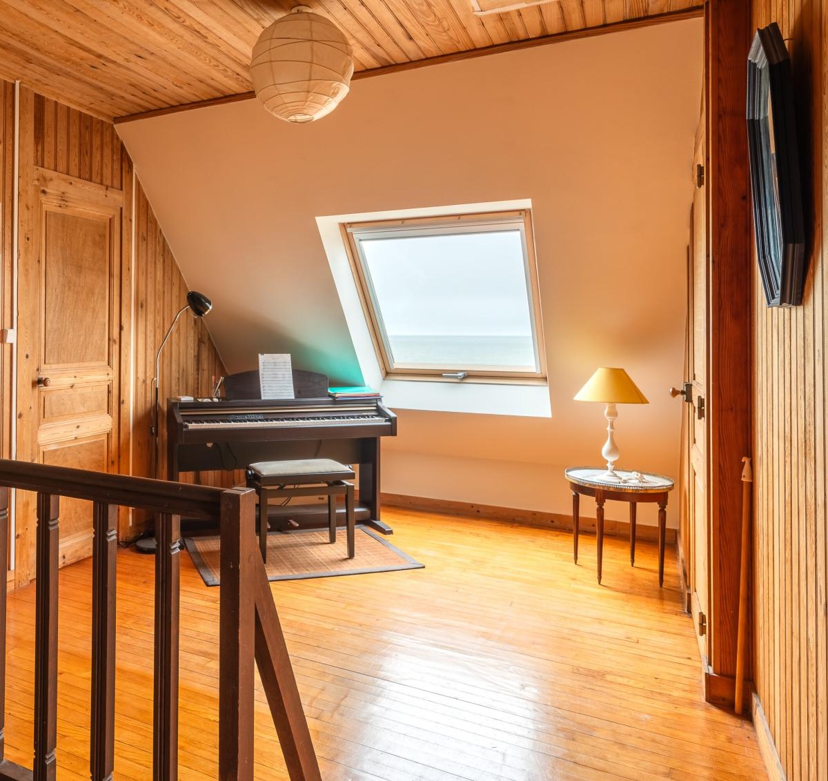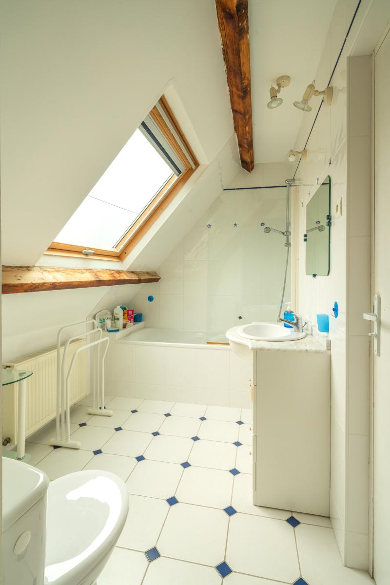 Etage : 3 chambres + palier à usage de bureau, salle de bains-wc.
