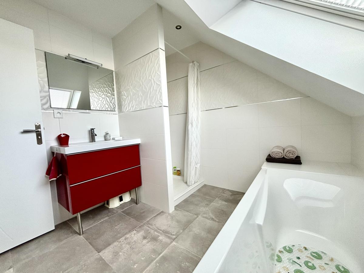 À l’étage: trois chambres avec placard, une mezzanine avec bureau et une salle de bain avec douche et baignoire.