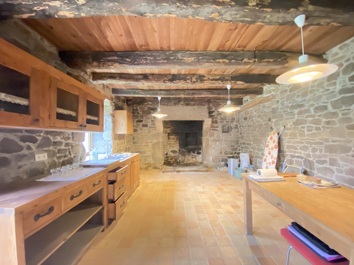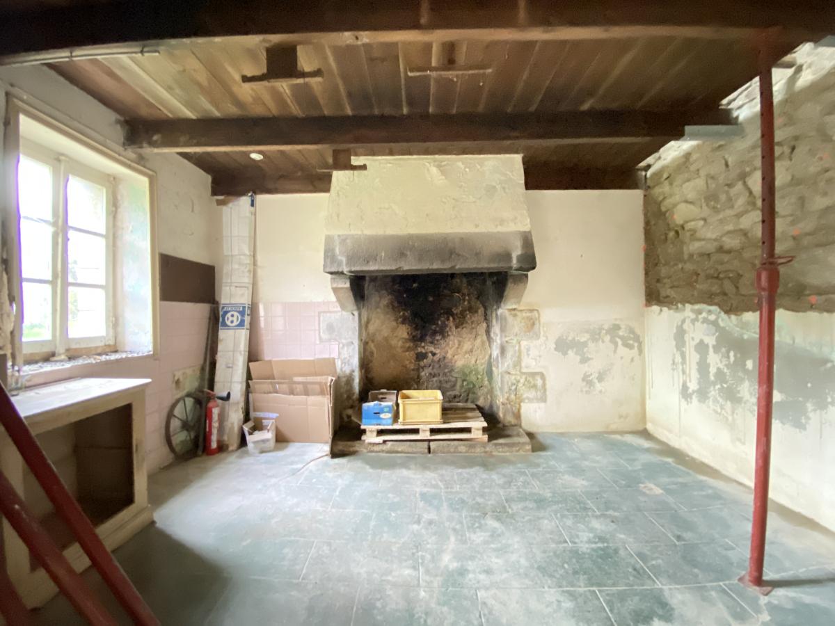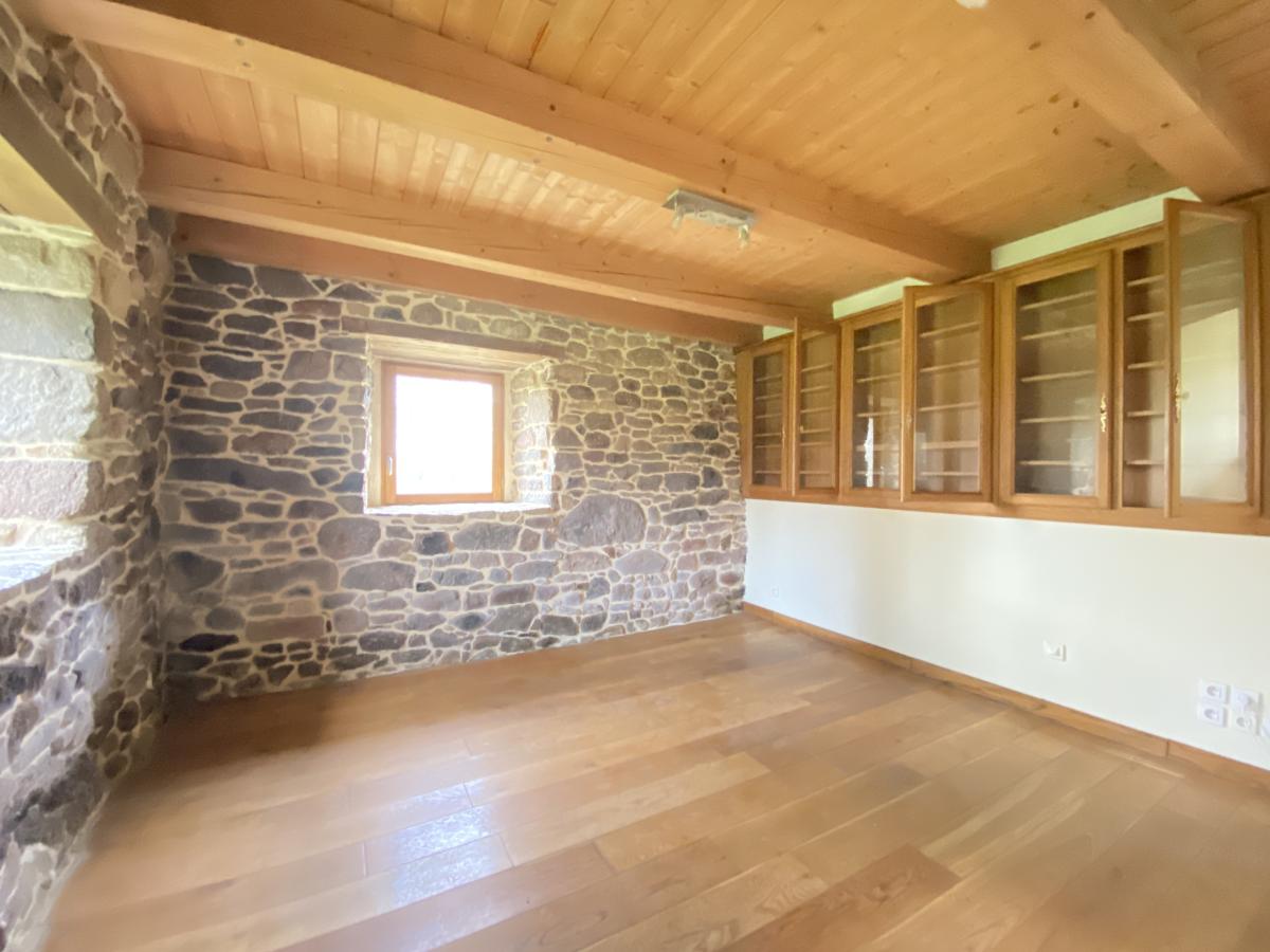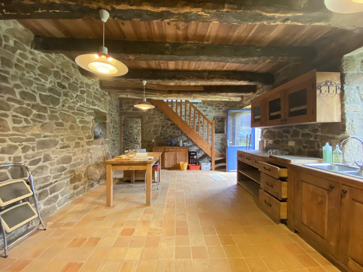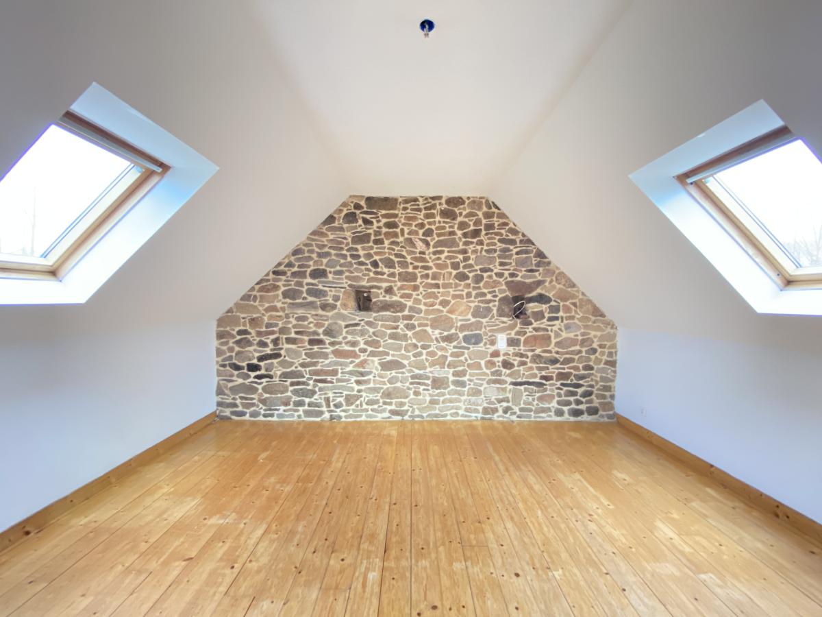 - Rez-de-chaussée : une cuisine/salle à manger, un salon avec poêle à bois, WC et une bibliothèque.