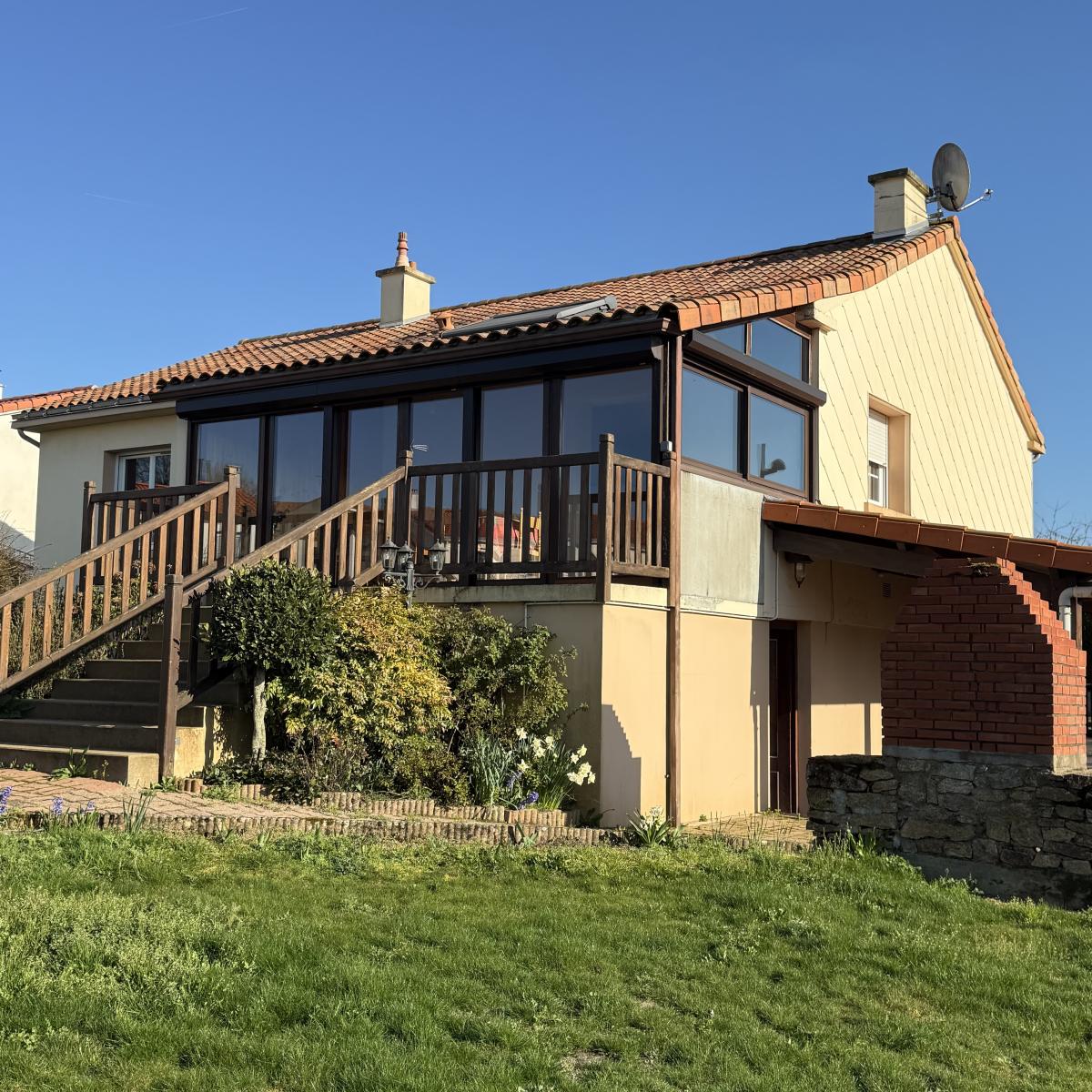 MORTAGNE SUR SEVRE, secteur EVRUNES cette maison sur sous-sol de 1969 d'une surface habitable d'environ 114 m² dispose au rez-de-chaussée d'un séjour/salon cuisine ouverte équipée et aménagée donnant sur une véranda de 16 m², une salle d'eau, wc, trois chambres . Un sous-sol avec garage et coin atelier, cave, une quatrième chambre avec douche/wc, un autre débarras sous la véranda et cave.