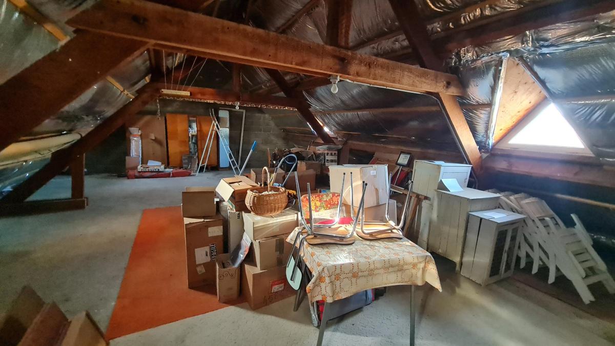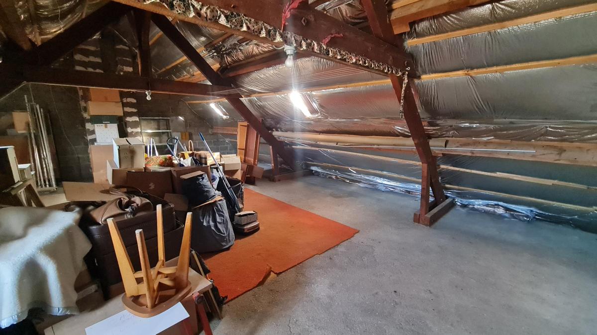 Dans les combles sur dalle béton 78 m² au sol pour 43 m² environ habitable.