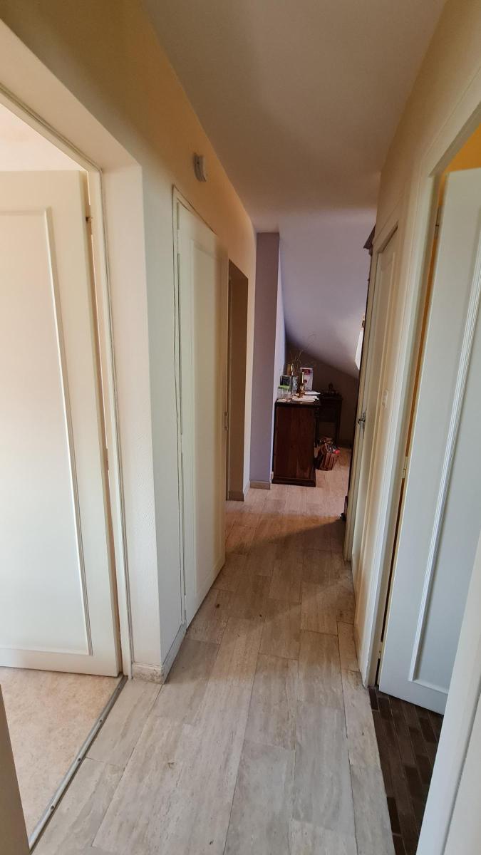 À l'étage un palier donnant sur une buanderie avec WC de 8.50 m² avec trappe d'accès aux combles, un séjour de 24.67 m², un balcon pour 5 m² environ, une cuisine séparée de 10.45 m² et 2 chambres de 10.76 m² et 10.58 m².