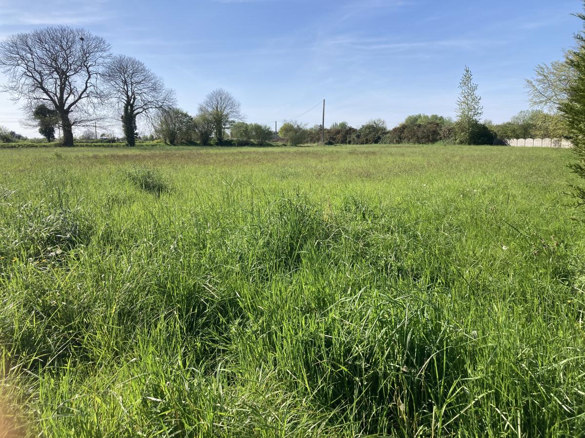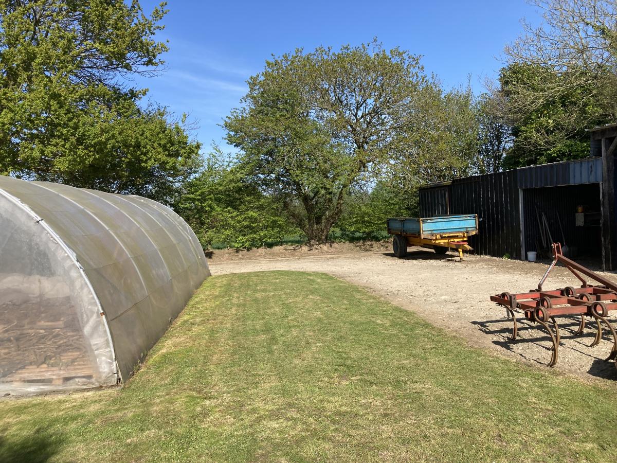 Petit hangar ouvert, jardin aménagé et parcelle de terre agricole.