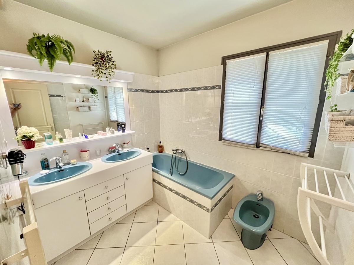 En demi-niveau, la maison propose une arrière-cuisine, une salle d’eau avec WC, une quatrième chambre indépendante, ainsi qu’un double garage.