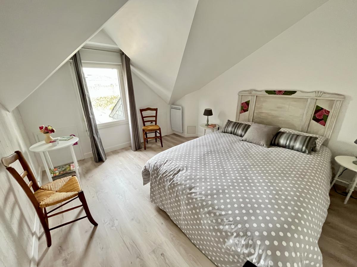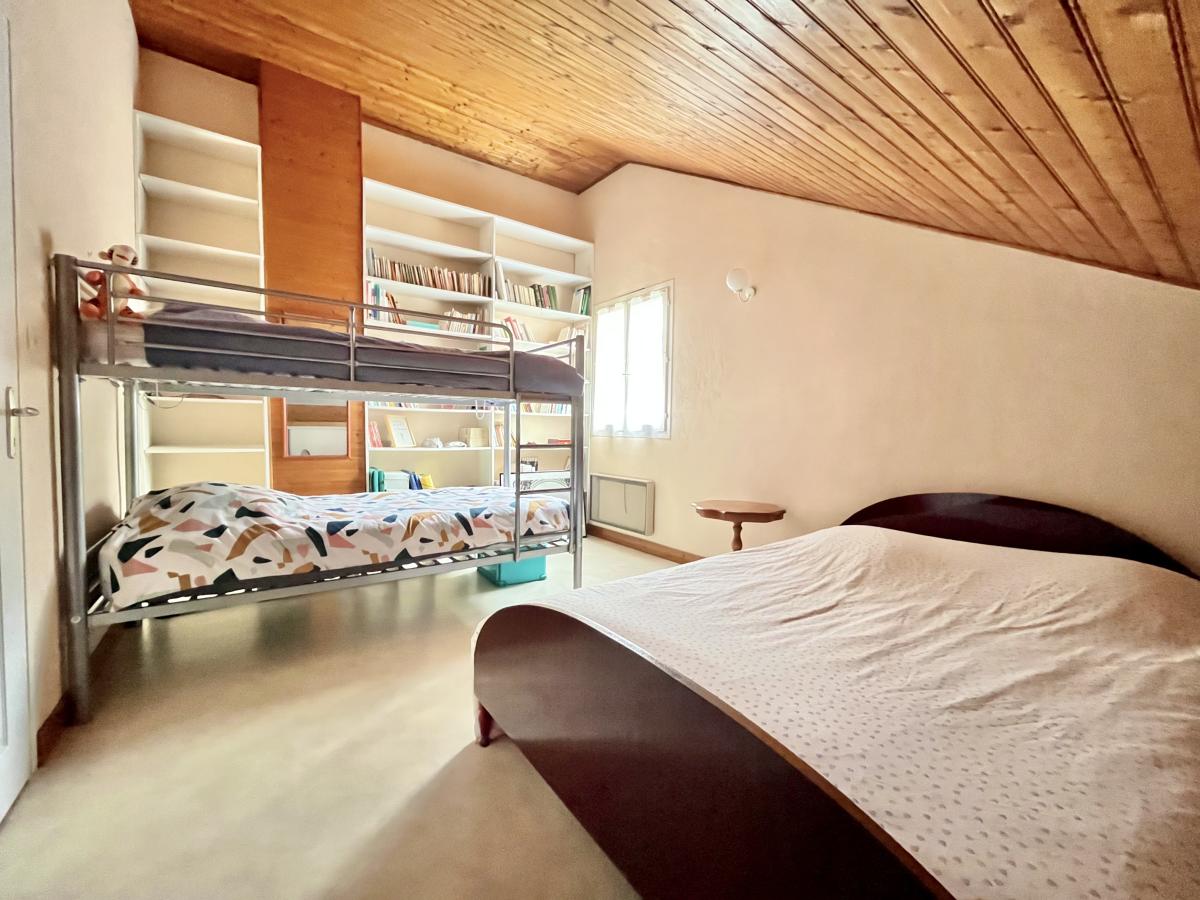 À l’étage, un palier dessert une première chambre, un grenier, une mezzanine ouverte sur le séjour et une autre chambre disposant de son lit mezzanine.