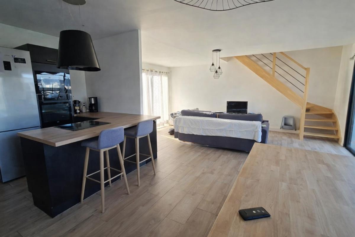 Au rez-de-chaussée, la maison offre une agréable pièce de vie lumineuse, ouverte sur le jardin, avec une cuisine aménagée et équipée