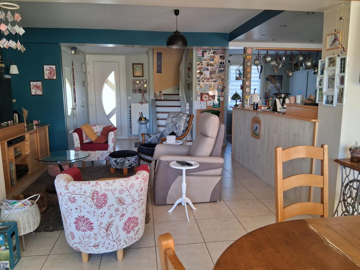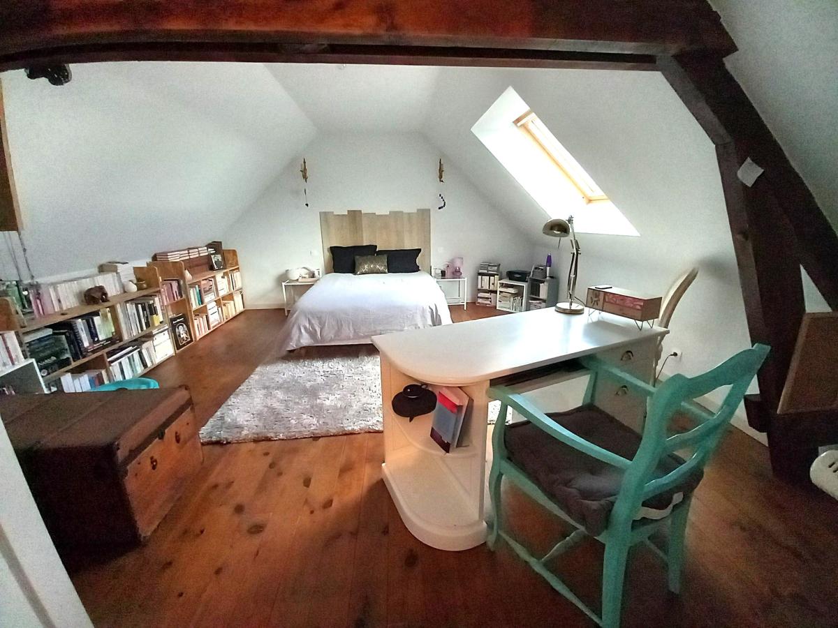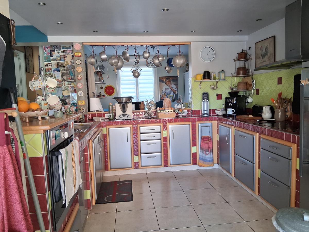 Maison aux pieds des commerces, offrant de belles prestations 120 m² hab, composée au RDC : entrée ouverte sur espace de vie de 70 m² comprenant : cuisine aménagée - salle à manger avec avancée/baies vitrées vue dégagée sur le jardin, (poêle à bois) - Salon et bureau - WC ; Premier étage : deux chambres - dressing - salle d'eau (douche) avec WC ; 2ème étage en comble : Palier et grande chambre (vélux électrique avec volet électrique). Cave. Buanderie. GARAGE et ATELIER jouxtant la maison : 145 m² (hauteur suffisante pour camping-car, camions, tracteurs....) conviendrait à un artisan. Possibilité d'agrandissement du RDC avec le garage. Menuiseries PVC/ALU. Pompe à chaleur (décembre 2018). Chauffe-eau solaire. Toiture côté jardin refaite en 2010). Cour et jardin d'agrément avec puits et pergolas- l'ensemble pour 1026 m².