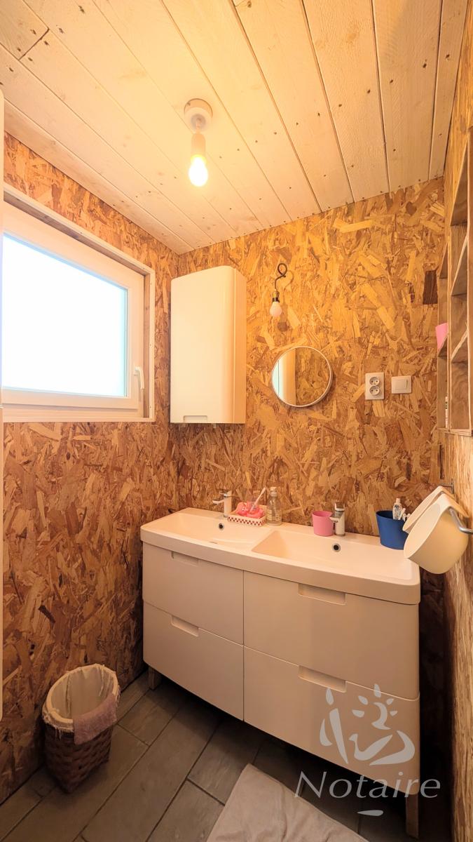 - Au rez-de-chaussée : cuisine toute équipée ouverte sur le séjour, bénéficiant d’un accès direct à la terrasse, agréable salon agrémenté d’une belle cheminée en pierre avec insert, cellier, WC, buanderie, salle de bains équipée d’un meuble vasque, d’une baignoire et d’une douche, avec WC.