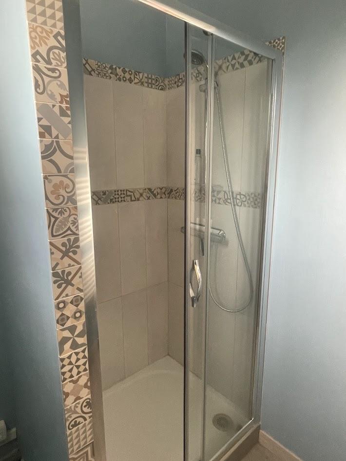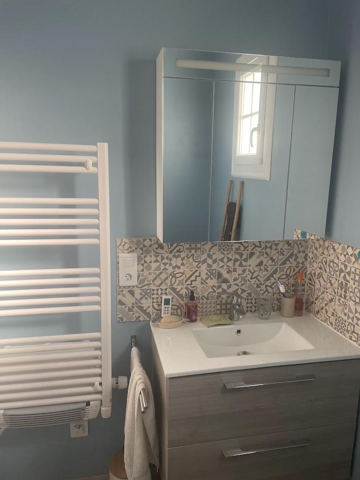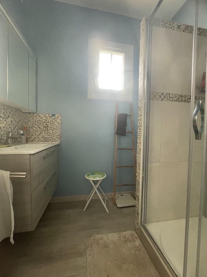 -Au rez-de-chaussée : Une entrée/couloir avec placard, une cuisine aménagée et équipée, une salle d’eau avec vasque et sèche-serviettes, une chambre, un salon/séjour lumineux