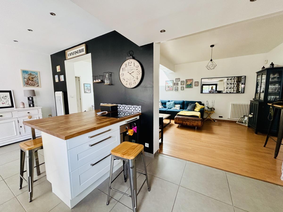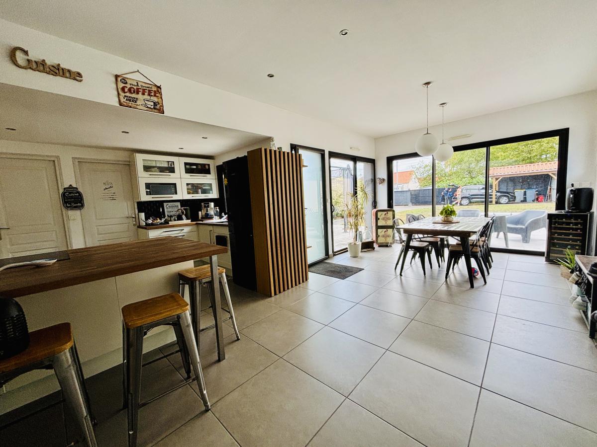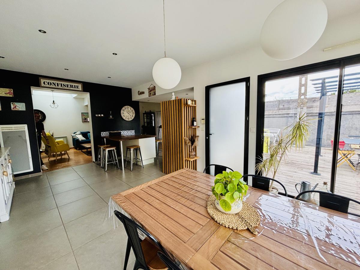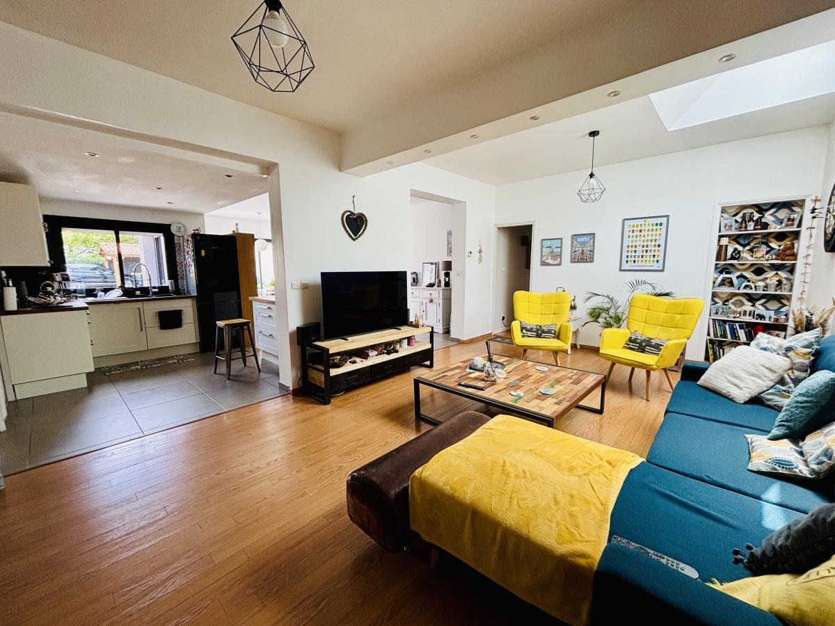 Maison de plain-pied, édifiée en 1950 et agrandie par la suite en 2013, en second rideau, en très bon état d’entretien. Elle se compose d’une vaste pièce de vie de 58 m², de quatre chambres, d'une lingerie, d’une salle de bains et d’un WC.