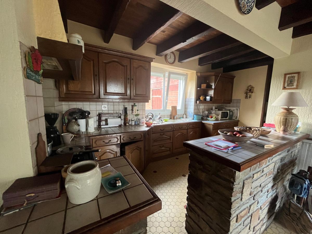 Elle se compose au RDC : un séjour ouvert sur cuisine aménagée, un salon avec cheminée, une cuisine aménagée, 2 chambres, un WC avec lave mains, une salle d’eau, un cellier et une arrière cuisine.