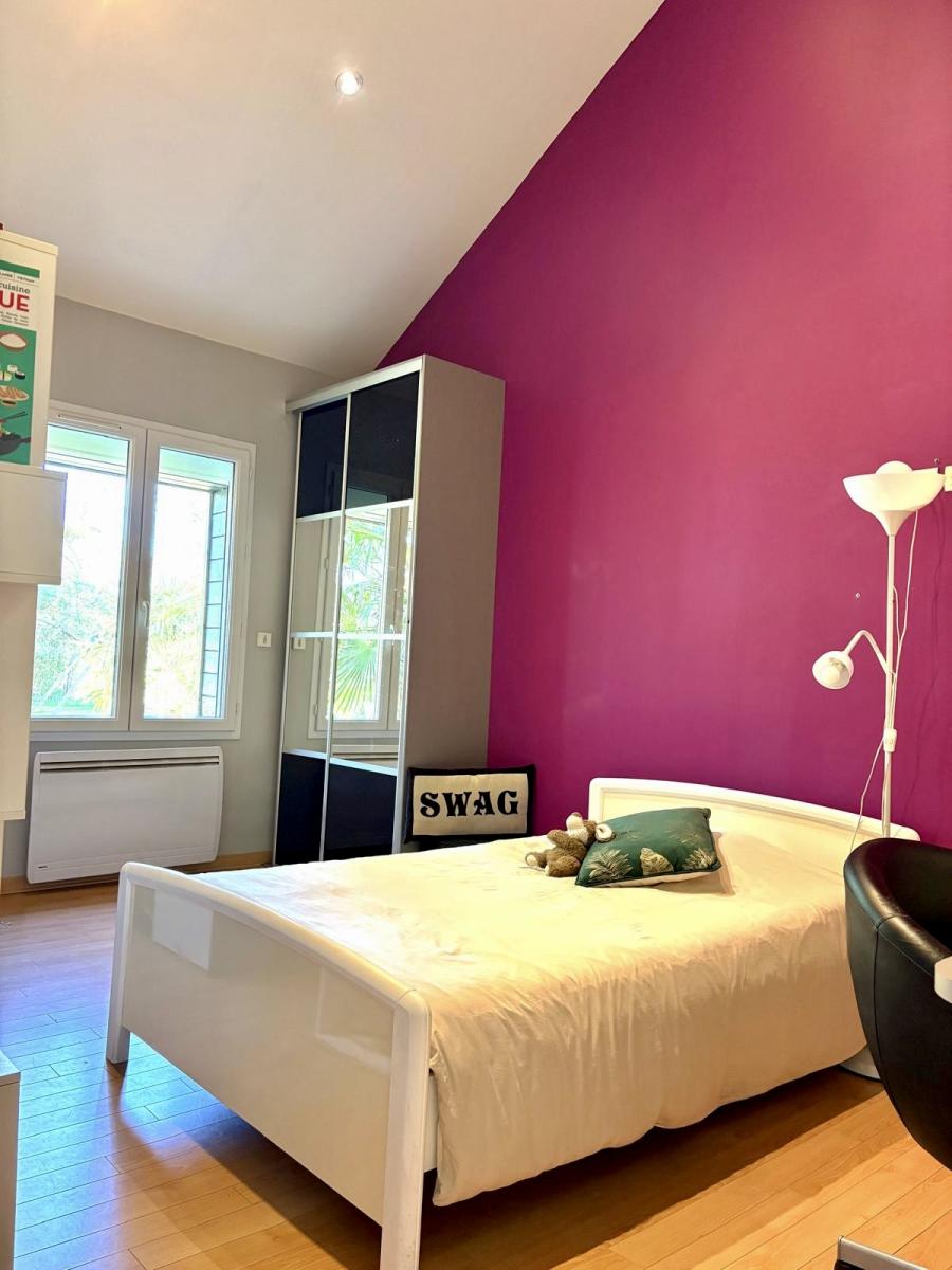 Côté nuit, la maison propose : une grande salle d’eau avec double vasque, 5 chambres, dont une suite avec salle d’eau privative, un bureau, des WC séparés avec lave-mains.
