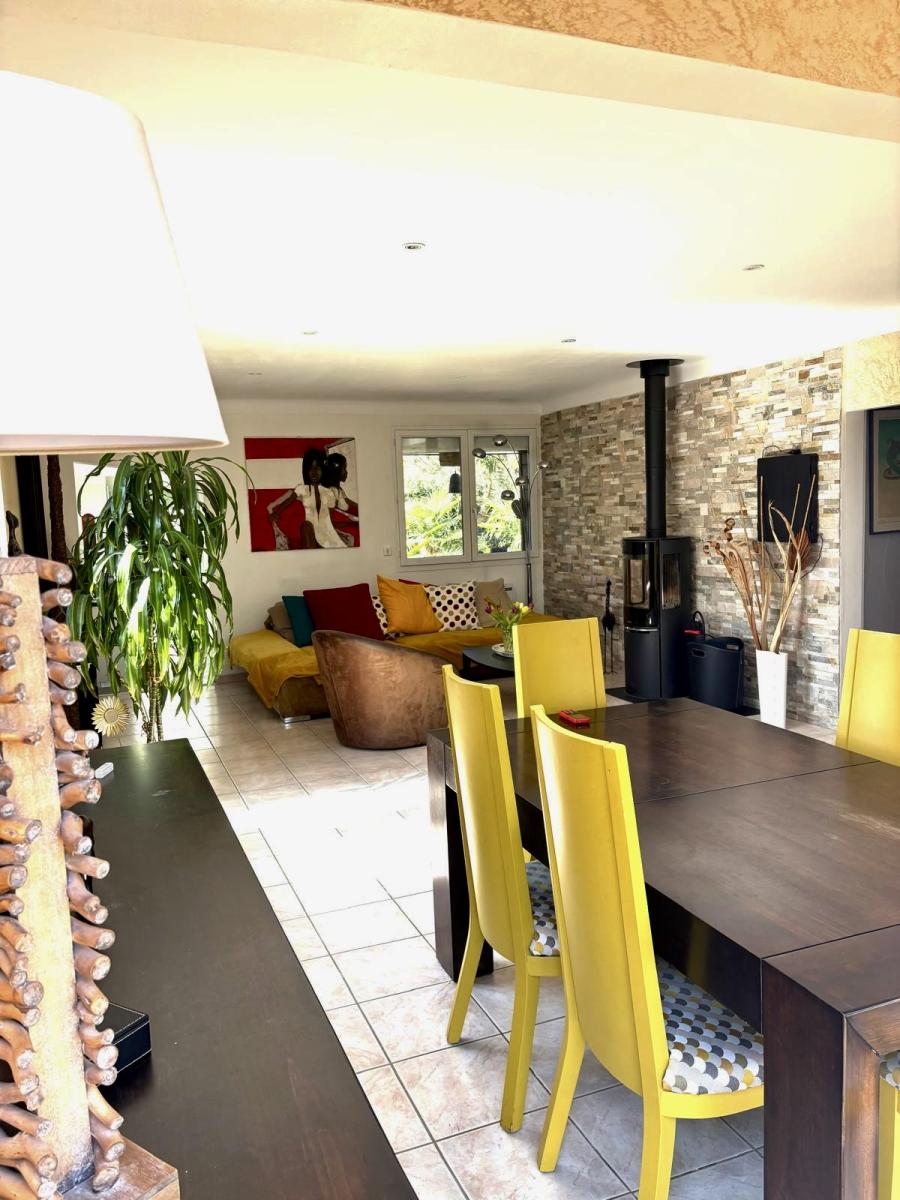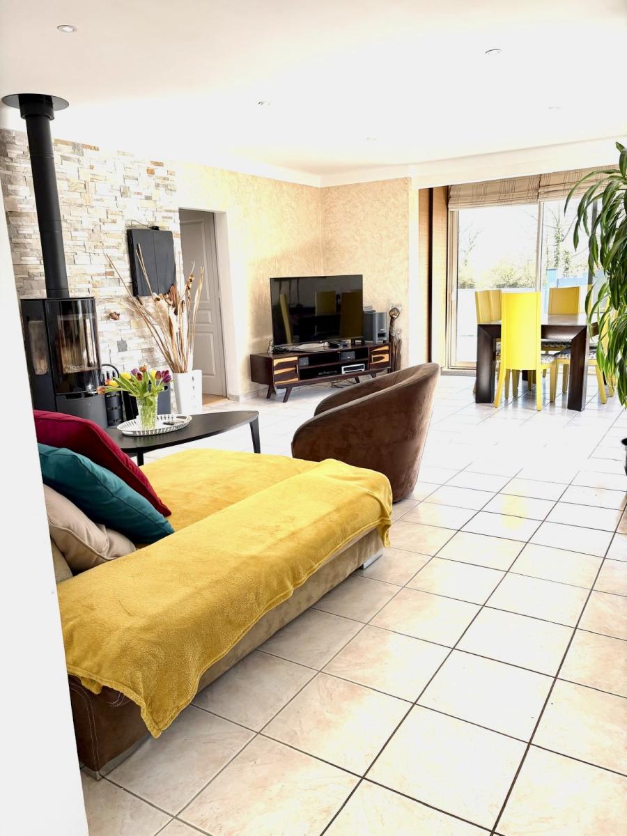 Elle dispose d’une entrée indépendante côté jardin et d’une belle pièce de vie traversante d’environ 35 m², chaleureusement agrémentée d’un poêle à bois.