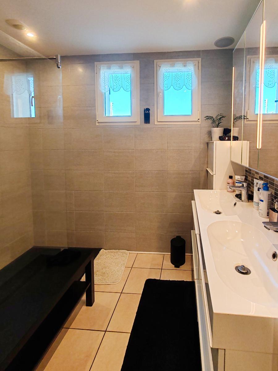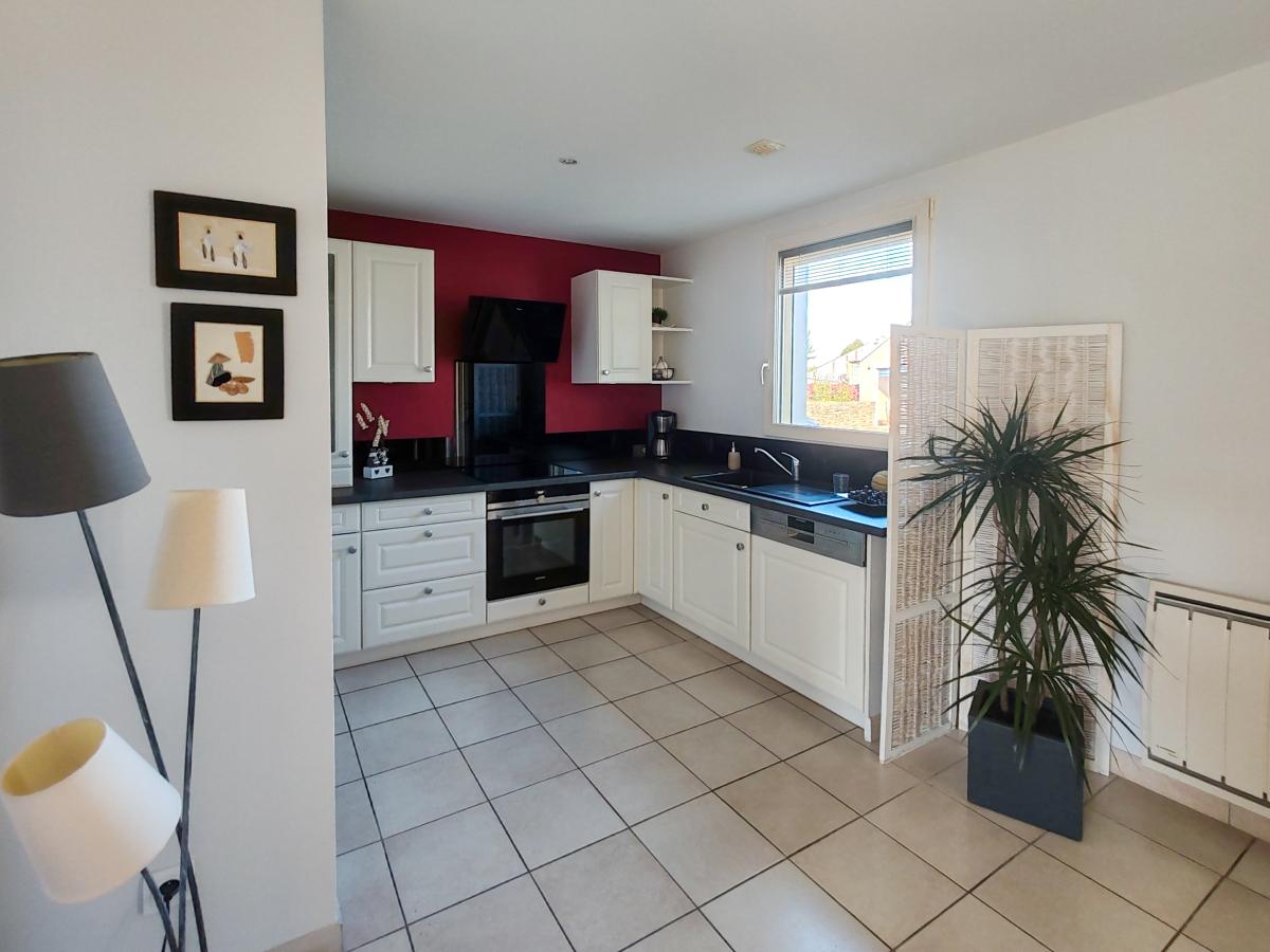 Au rez-de-chaussée, une cuisine aménagée et équipée ouverte sur une lumineuse pièce de vie agrémentée d'un poêle à pellets, une chambre, une salle d'eau contemporaine avec douche à l'italienne et double vasque, une buanderie et un wc.