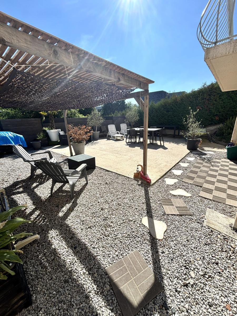 au rez : d'une pièce de vie avec accès sur le jardin , d'une cuisine ouverte et équipée , d'un wc et d'une buanderie.