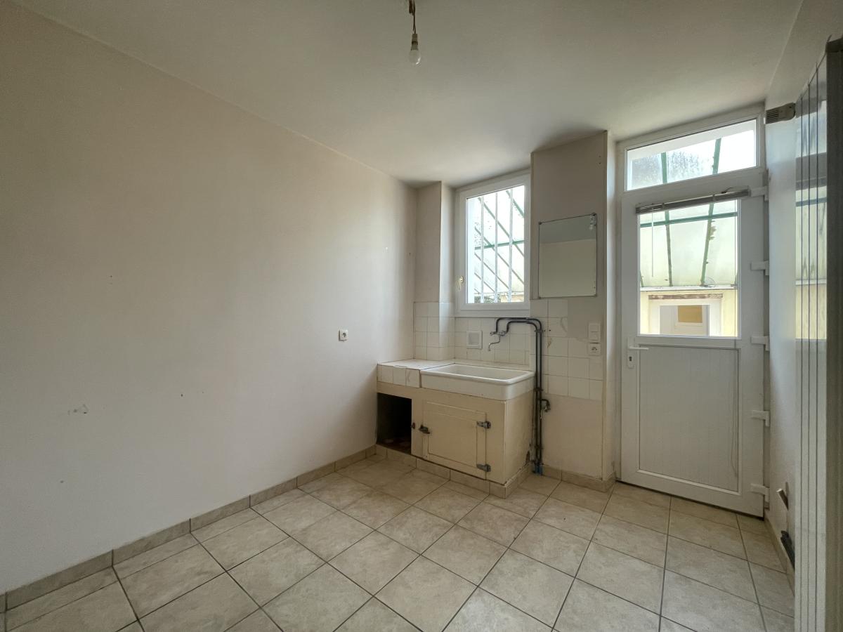 Entrée avec départ d'escalier distribuant un séjour ouvert sur cuisine équipée et aménagée puis par un dégagement accès aux WC et à la buanderie donnant directement sur le préau. Une salle à manger avec cheminée et parquet chevron complète ce rez-de-chaussée. A l'étage un palier distribue une grande salle de bain avec, douche, baignoire, et WC, puis 3 chambres dont une avec un dressing en enfilade. Au 2ème étage : combles aménageables possible d'environ 30m².