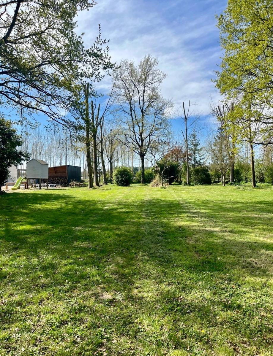 Un grand jardin avec une terrasse couverte et une cuisine d'été aménagée.