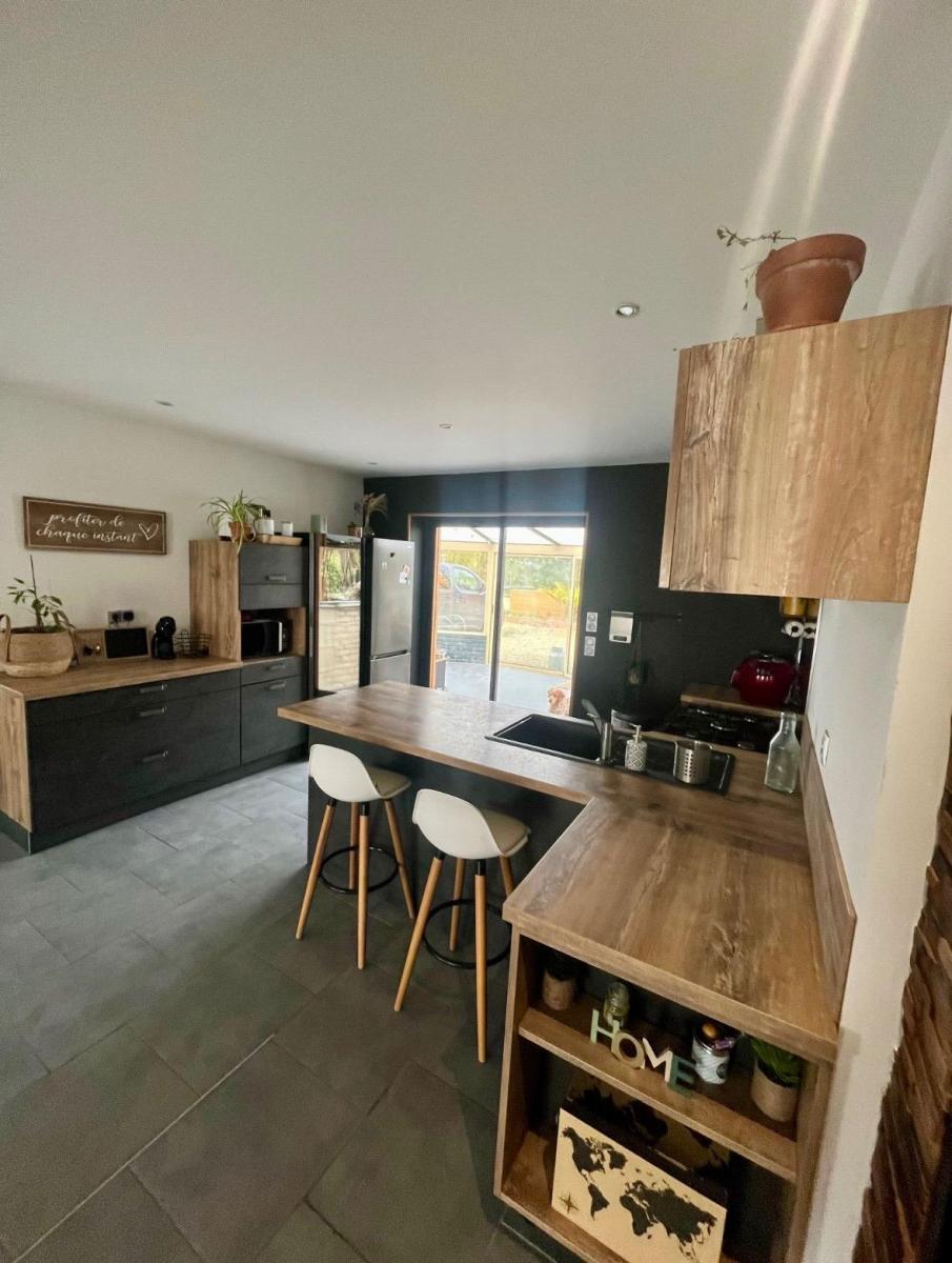 - au RDC : une grande pièce à vivre avec cuisine équipée, un salon avec cheminée, et un séjour,