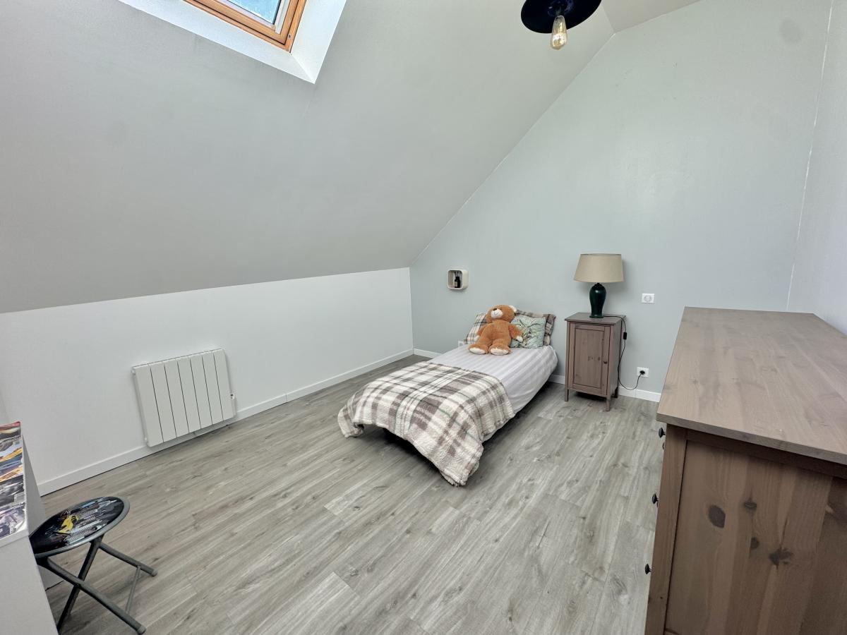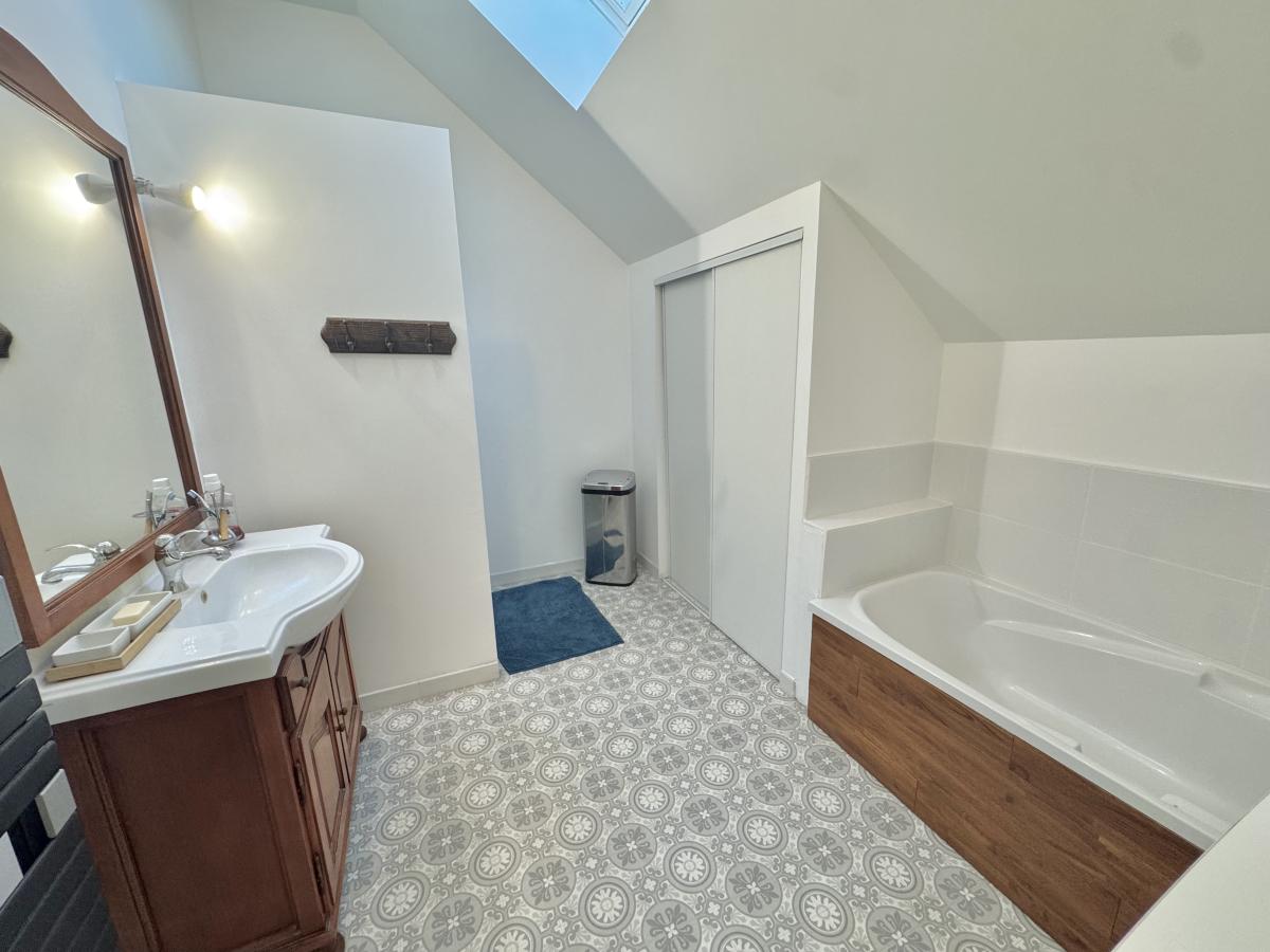 À l’étage, le potentiel se poursuit : d’un côté, un grenier d’environ 25 m² n’attend que votre projet pour être aménagé selon vos envies. De l’autre, trois chambres, une salle de bains avec baignoire et douche, ainsi que des WC indépendants composent l’espace nuit.