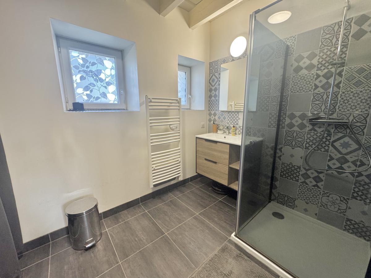 Le rez-de-chaussée comprend également un WC indépendant, un coin bureau, parfait pour le télétravail, ainsi qu’une chambre avec salle d’eau privative. Une vraie vie de plain-pied.