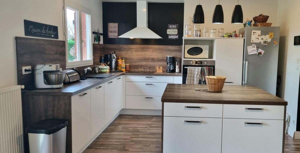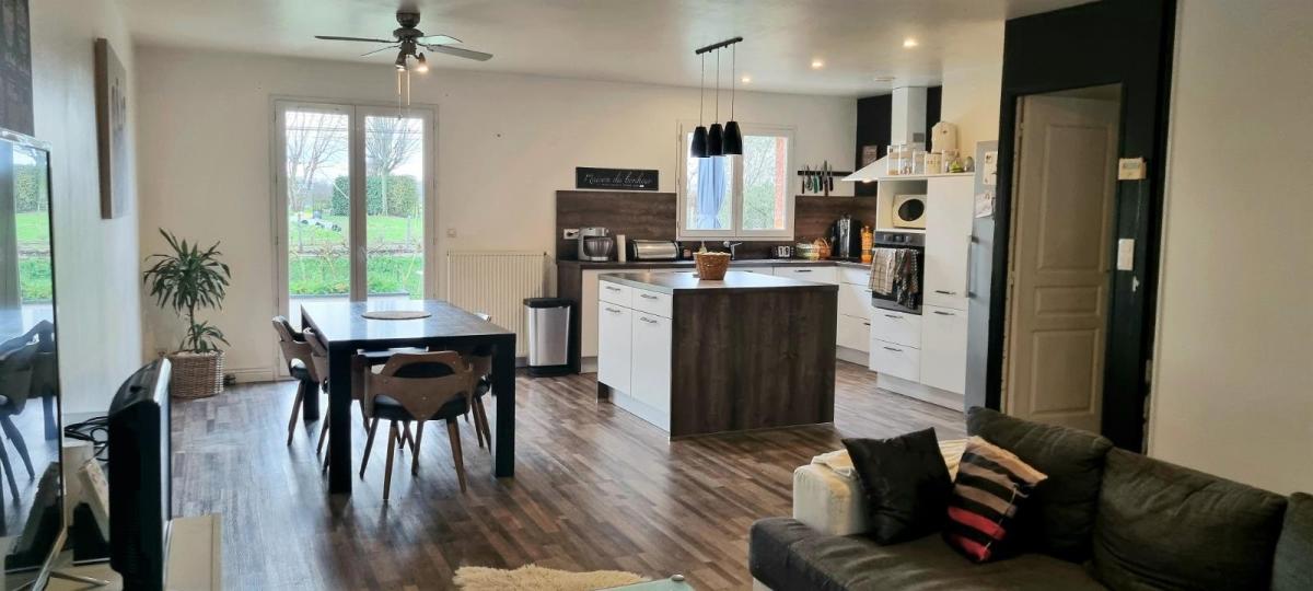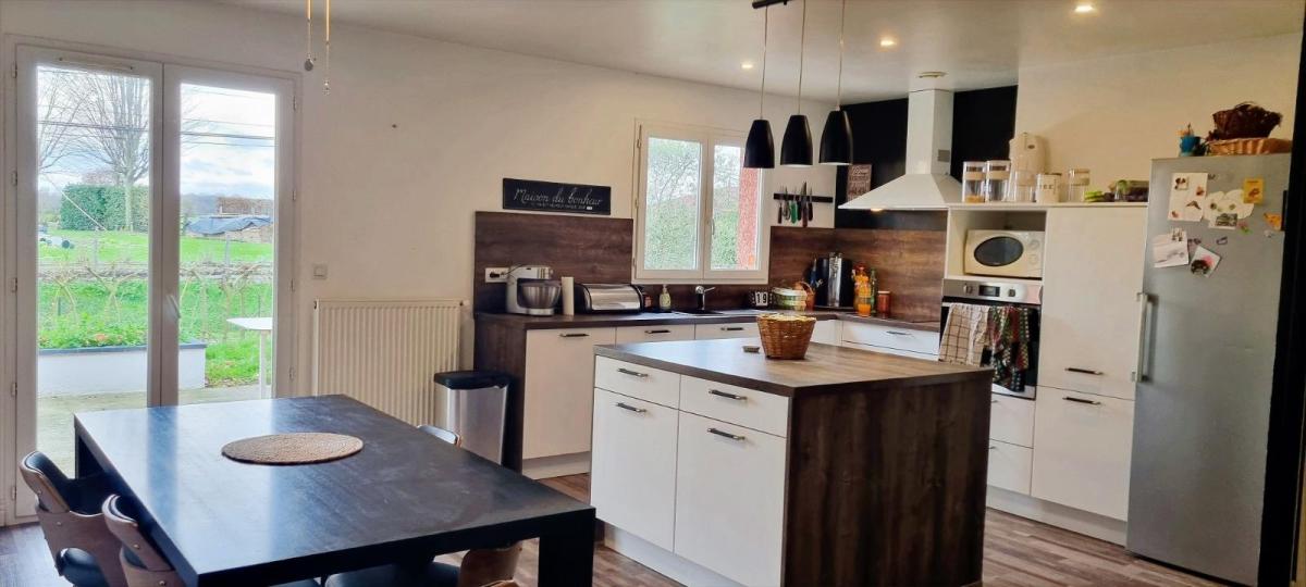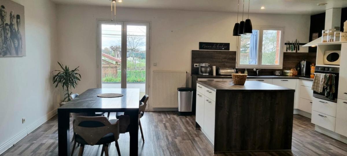 NEUVILLE LES DAMES Venez découvrir cette maison de plain pied construite en 2004 à 500m des écoles, comprenant une pièce à vivre avec cuisine équipée de 45m² avec accès à la terrasse. Le logement dispose de cinq chambres, allant de 10.40 m² à 17.5 m² pour l'espace nuit. Une salle de bains avec baignoire et douche complète le bien. A l'extérieur, un espace buanderie de 14.5m² avec évier pouvant facilement être transformée en studio indépendant pour adolescent.  Parcelle close de 824m². Chauffage au gaz de ville, adoucisseur. Les informations sur les risques auxquels ce bien est exposé sont disponibles sur le site Géorisques : www. georisques. gouv. fr