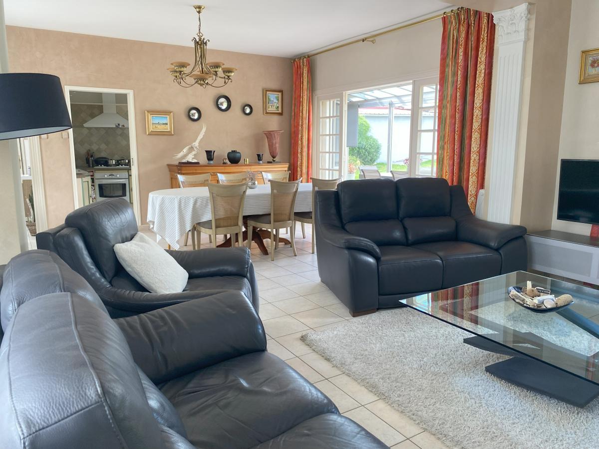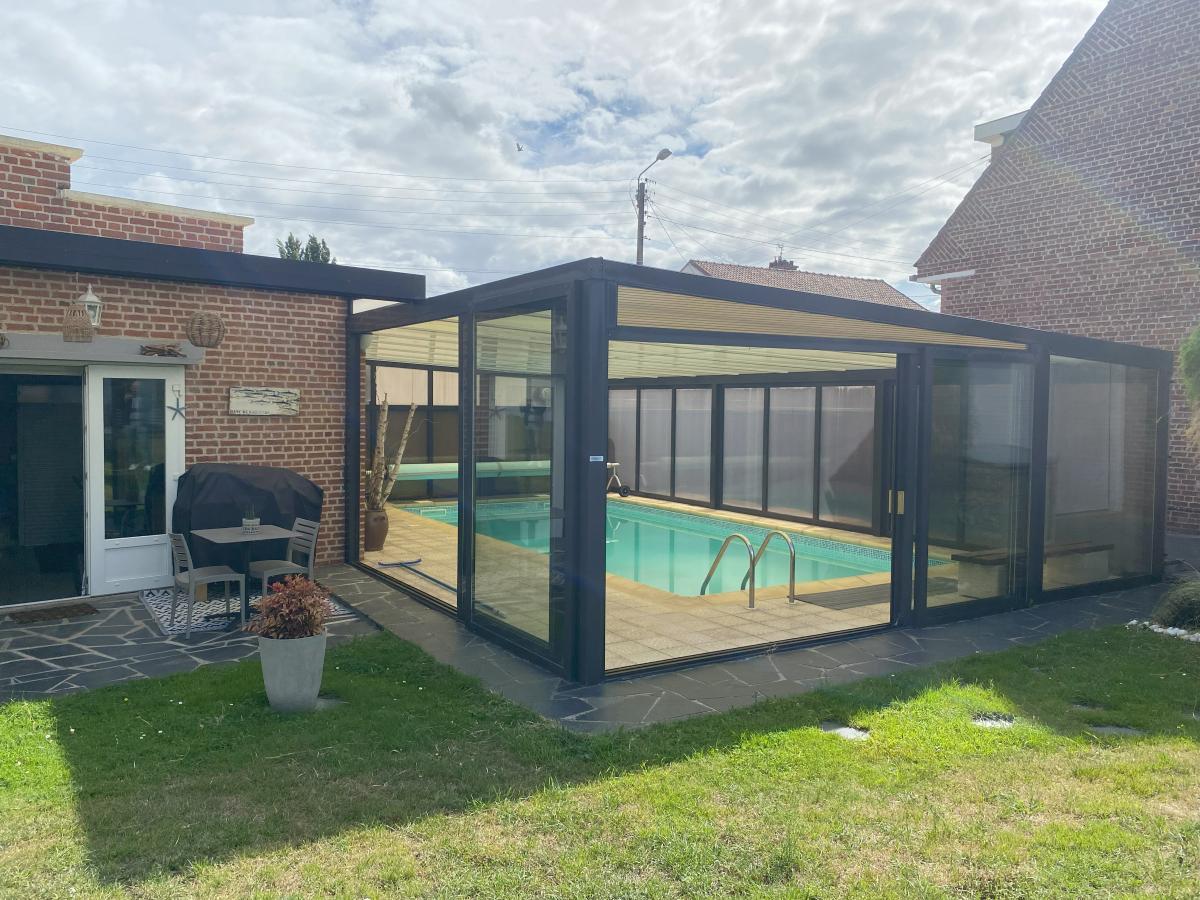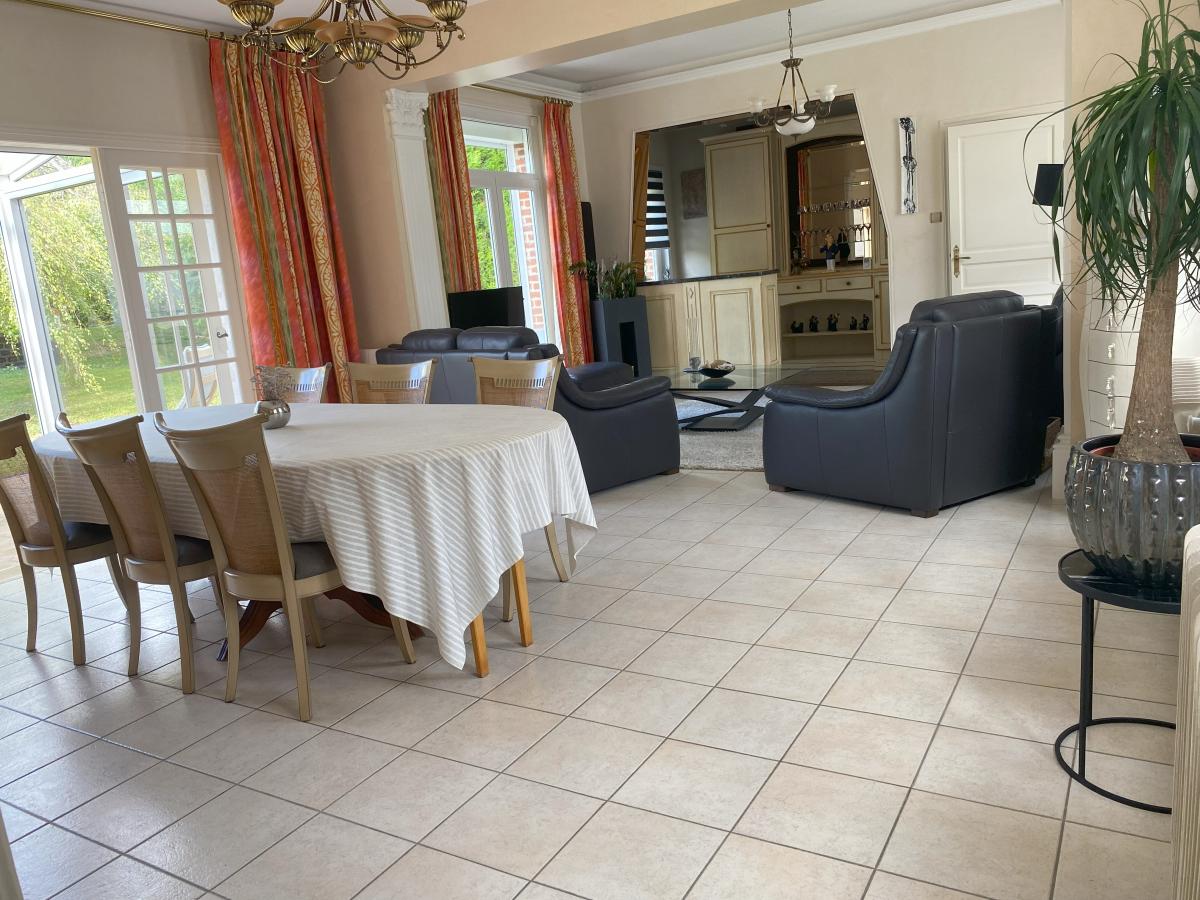 VITRY EN ARTOIS - Maison individuelle comprenant : s/cave - Au RDC : entrée, bureau, séjour-salon spacieux avec coin bar, cuisine équipée, cellier, véranda - A l'étage : palier, 3 chambres, salle de bains - C/C gaz - Piscine couverte - Garage, atelier - Grand garage avec accès sur l'arrière d'environ 120 m² - Jardin arboré clos - S/1046 m²