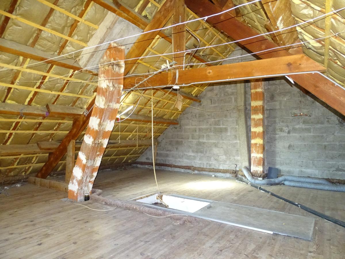 A l'étage, avec accès par échelle de meunier (escalier à créer) : grenier isolé de 37 m² et une chambre sur le pignon Est (16 m²).