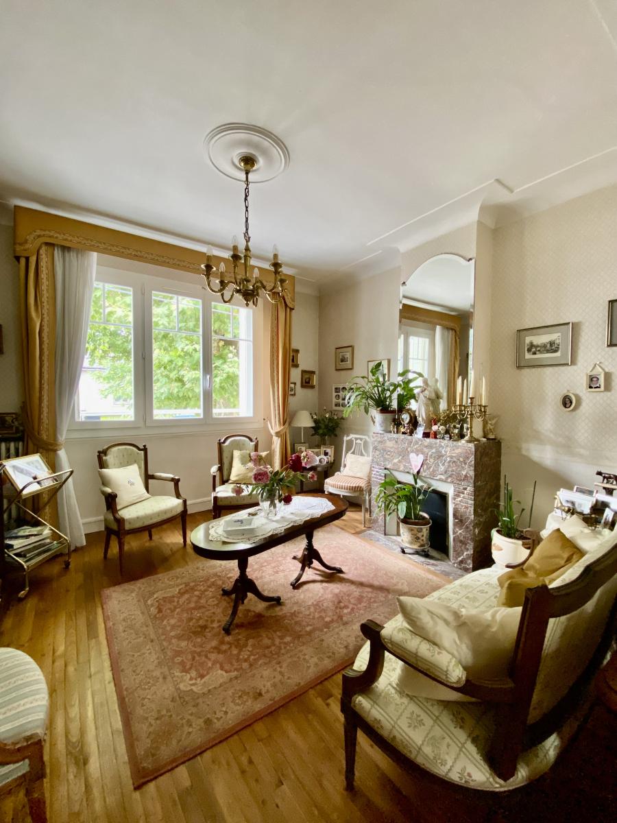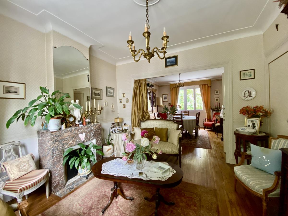 Salon séjour traversant sur parquet avec une cheminée en marbre,