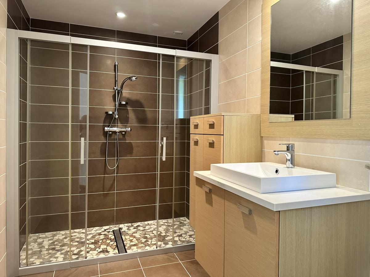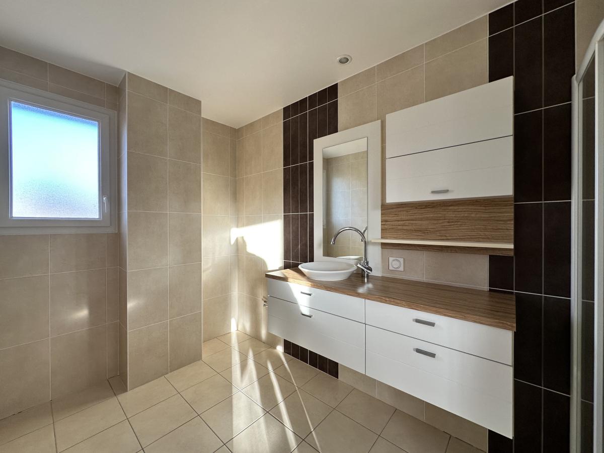 À l’étage : une pièce palière avec placards, trois chambres dont deux avec balcon, une salle d’eau avec douche et vasque, ainsi que des WC séparés.