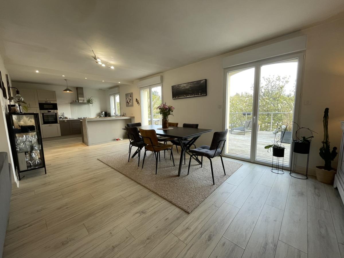 Elliant, NOUVEAUTE, maison familiale LUMINEUSE de 1986, située à pied des commodités. D'une surface d'environ 146 m2, elle se compose d'une grande entrée, cuisine ouverte sur séjour de 50 m2 avec poêle à pellets, donnant sur terrasse exposée Sud, une chambre, salle d'eau, wc et garage. A l'étage, dégagement, trois chambres, salle de bains, wc et placard. Grenier et cave. Jardin de 1.303 m2. EXCELLENT ETAT.