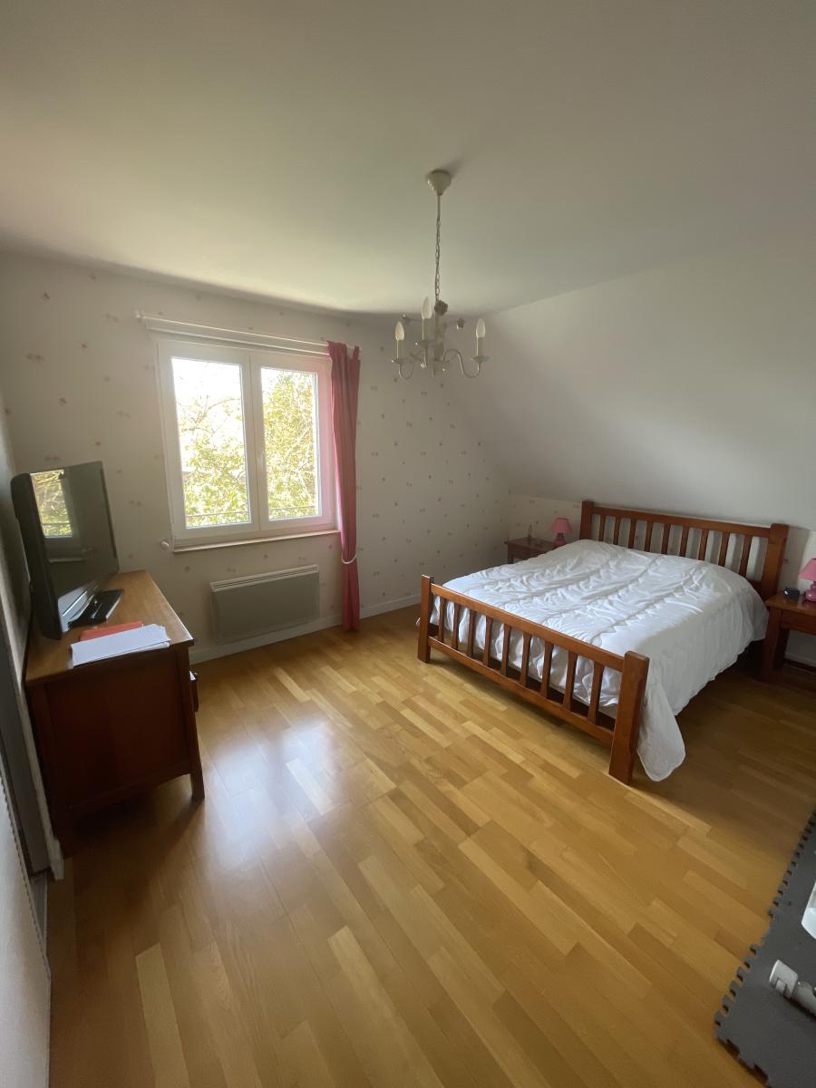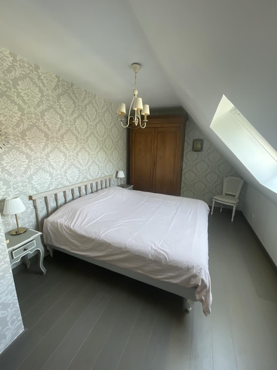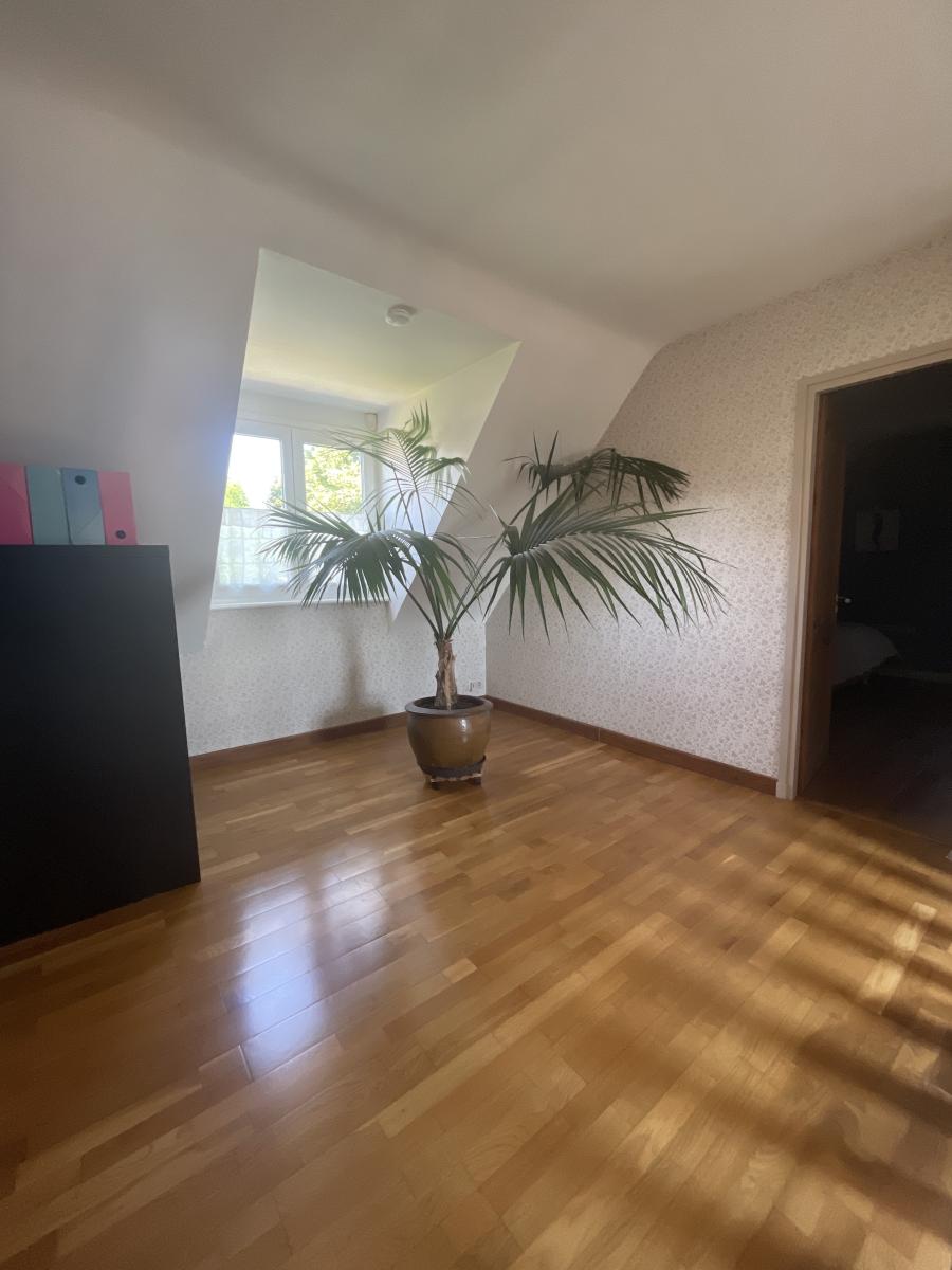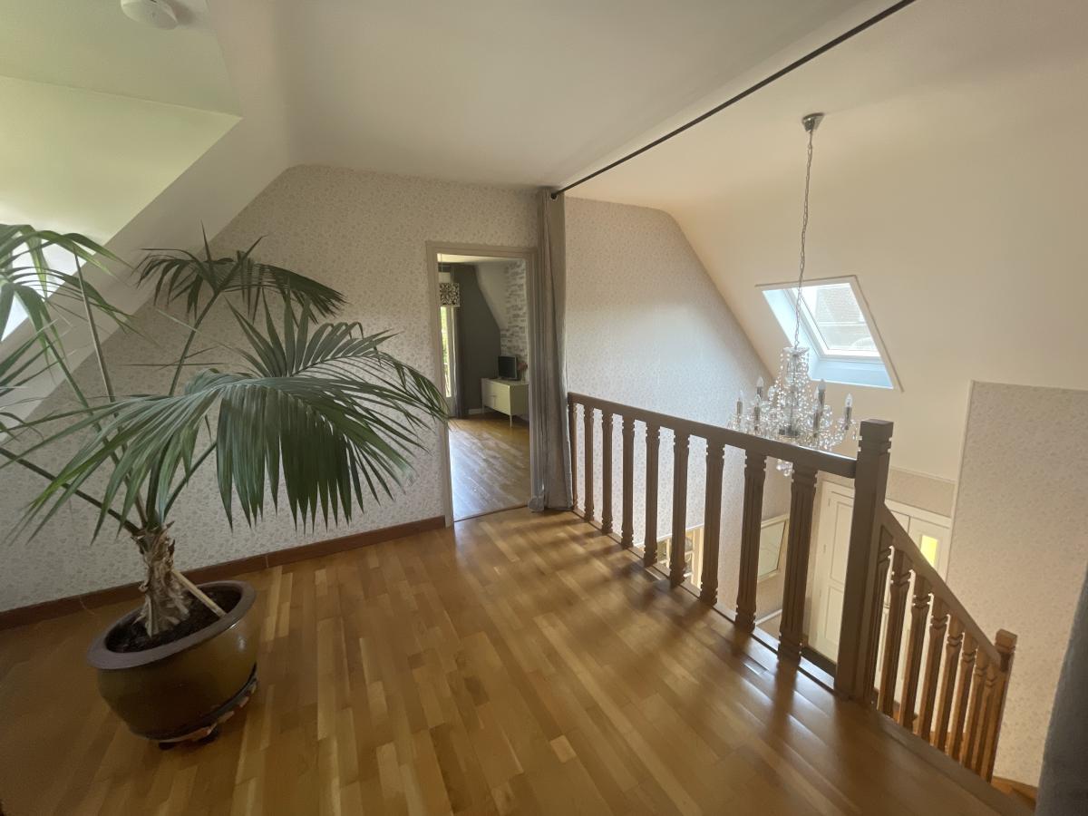 L’étage révèle un grand palier aménageable en bureau ou espace détente, desservant trois belles chambres dont deux avec placards intégrés, ainsi qu’une salle de bains et un couloir menant à une pièce supplémentaire pouvant faire office de quatrième chambre.