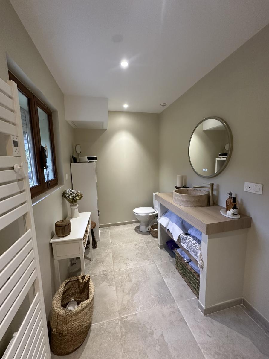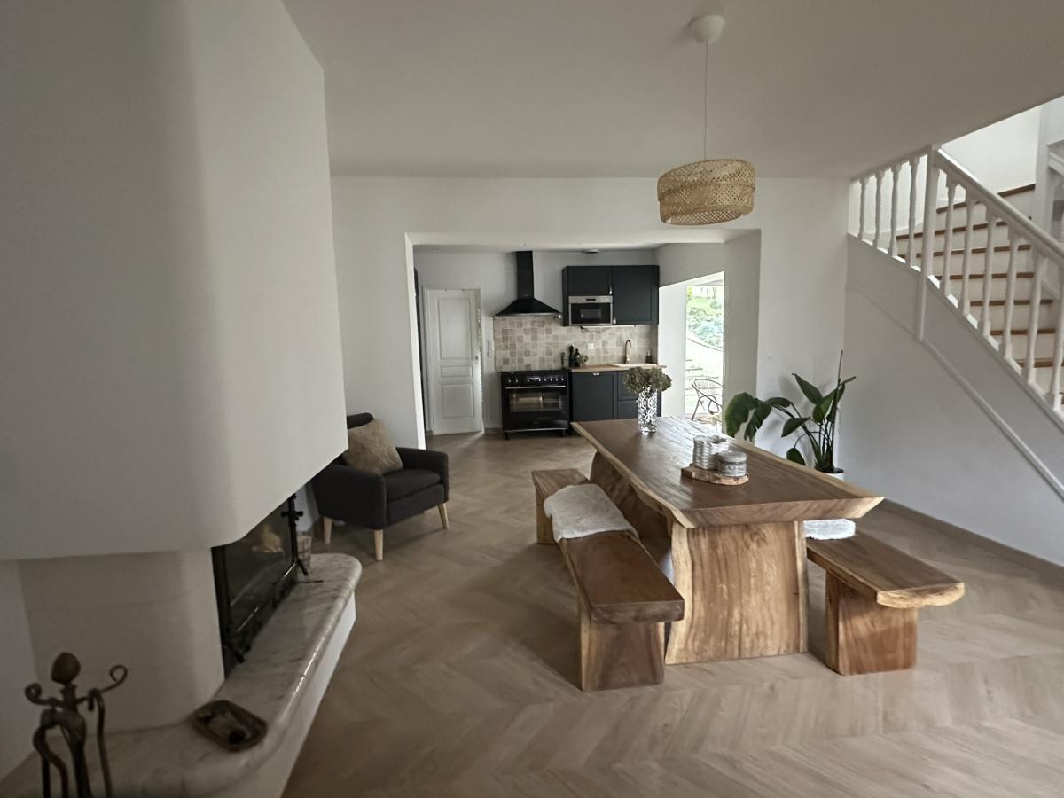 Au rez-de-chaussée : Une vaste pièce de vie baignée de lumière, avec cheminée à feu de bois, une cuisine moderne et équipée, Une salle de bains, Une pièce aménagée polyvalente (bureau, chambre d’appoint, salle de jeux…)
