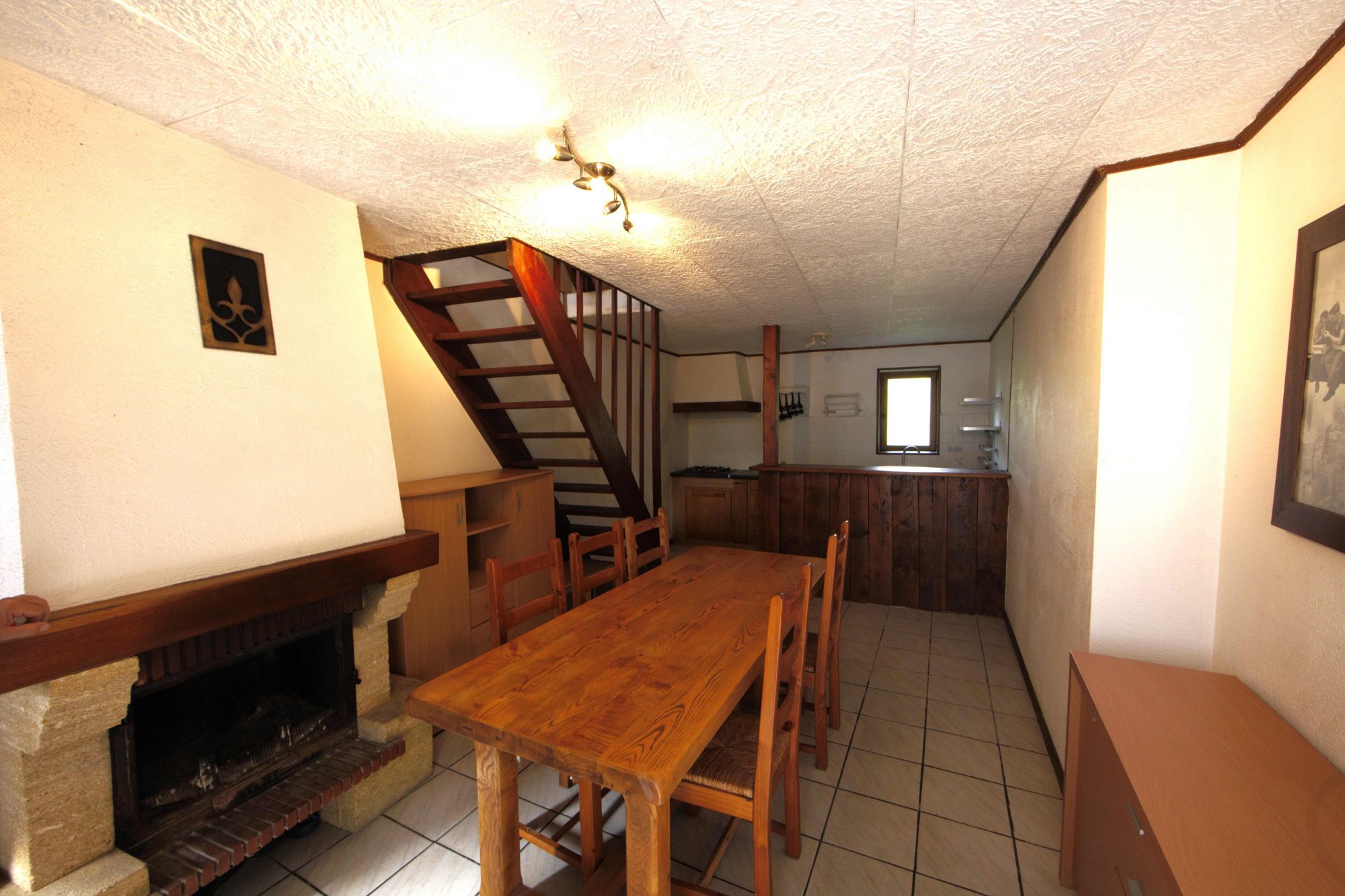 Au rez-de-chaussée: une pièce cuisine-séjour avec cheminée et une terrasse.