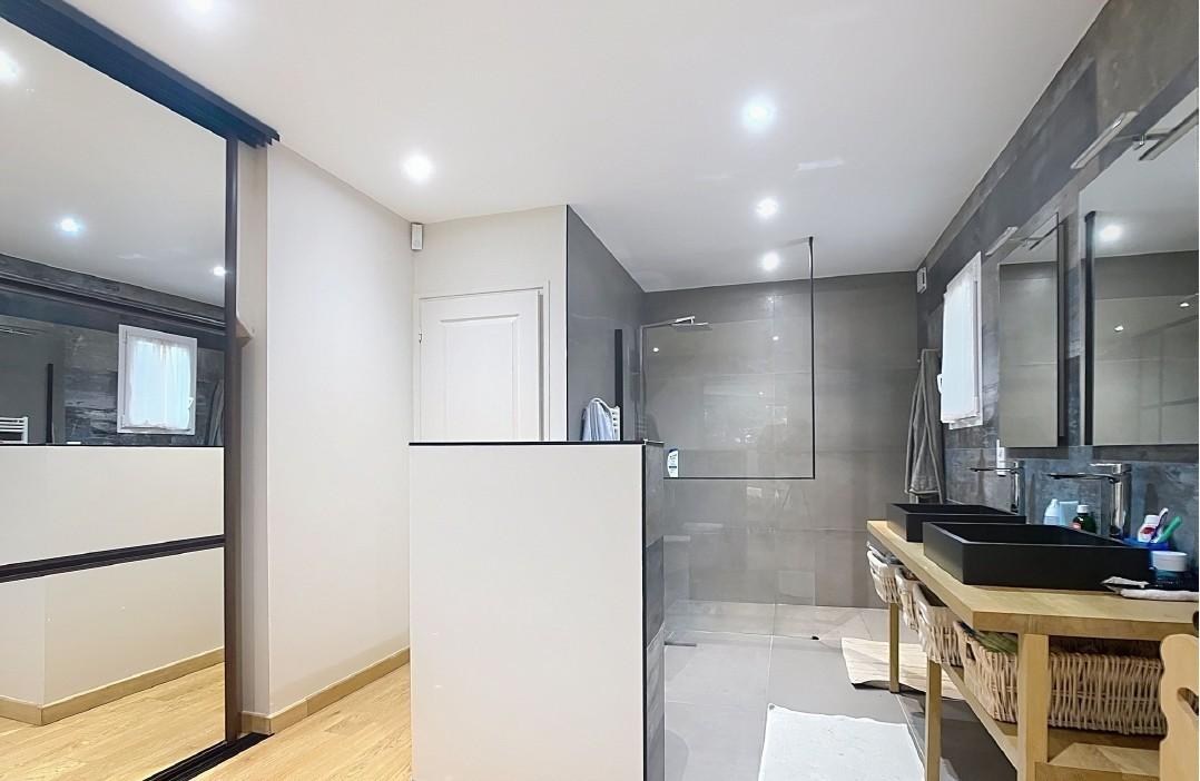 - Au rez-de-chaussée : entrée avec placard, cuisine, séjour-salon avec poêle à bois, buanderie, WC avec lave-mains, suite parentale avec salle d’eau, WC et dressing.