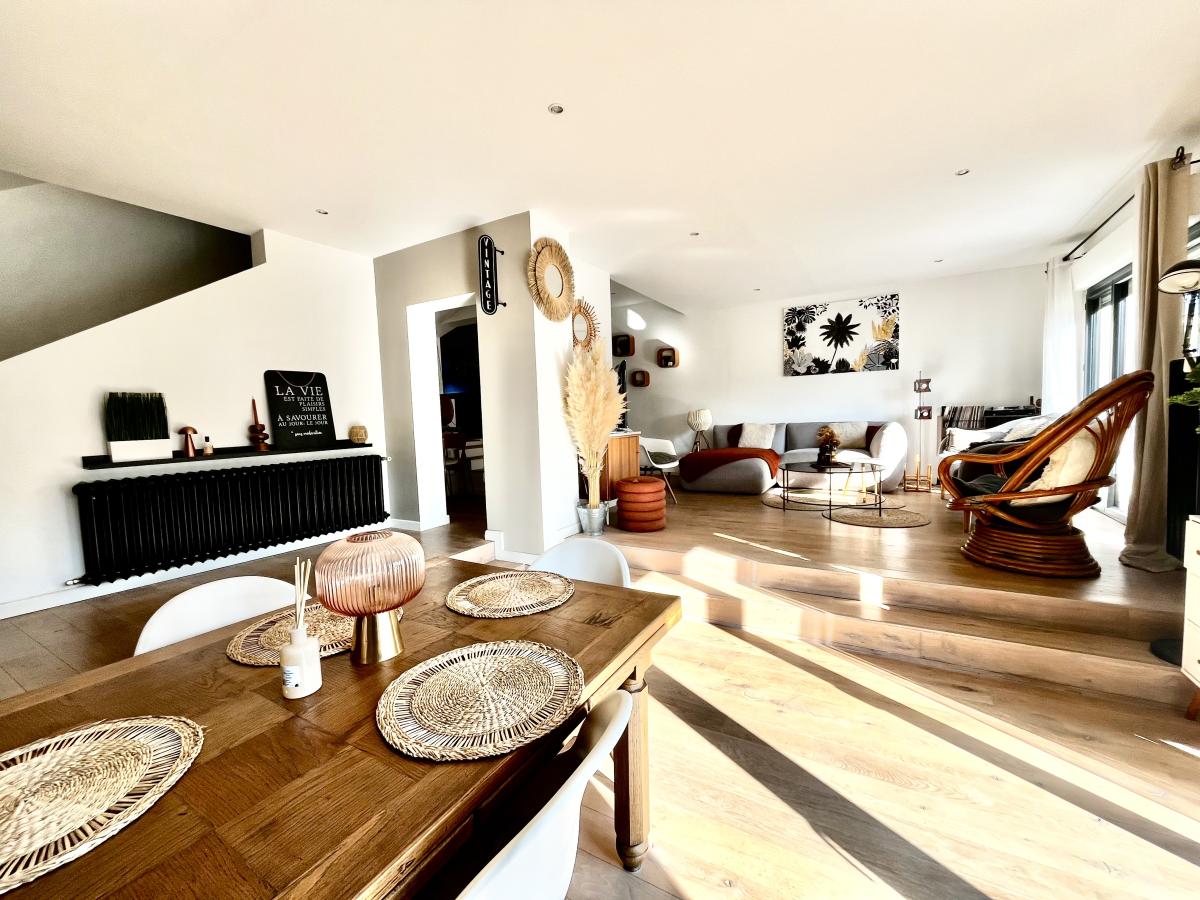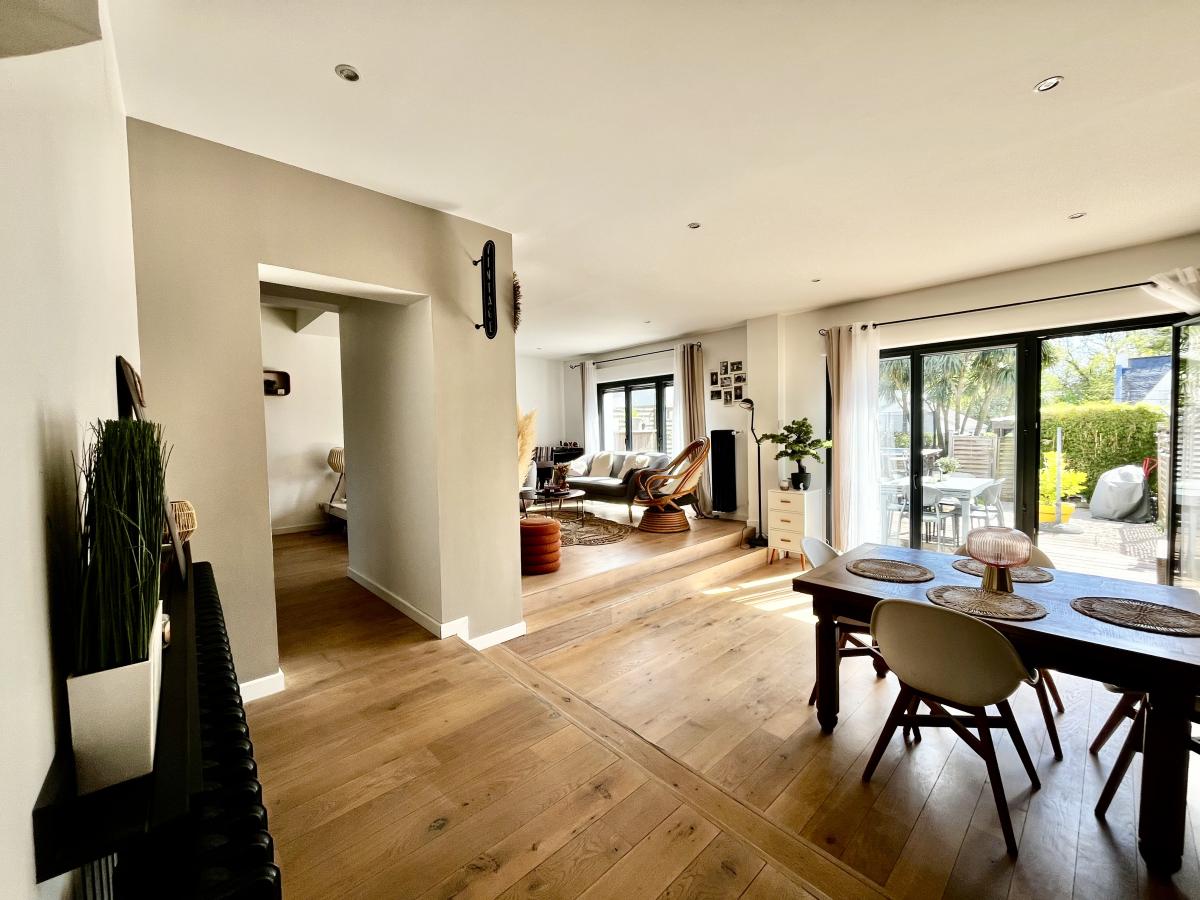 ORVAULT, dans le quartier très recherché du Petit Chantilly, beaucoup de charme pour cette maison d'environ 150m² rénovée en 2017 comprenant au rez-de-chaussée, une entrée avec placard, une grande pièce à vivre très chaleureuse et lumineuse sur parquet donnant accès à une terrasse exposée sud-est, une cuisine aménagée et équipée, une arrière cuisine, des wc et un espace bureau.